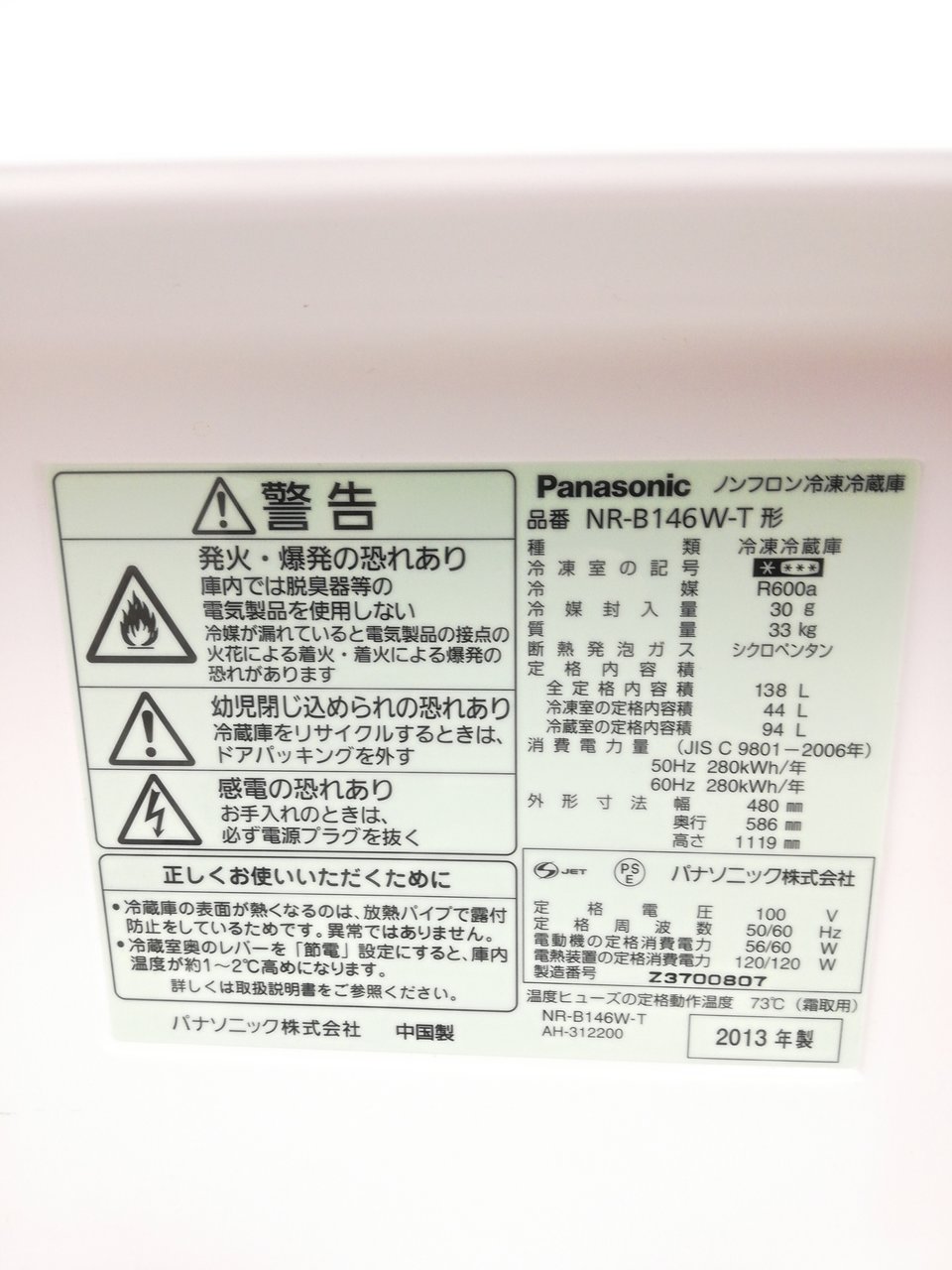 【オフィス家電】2ドア冷蔵庫パナソニック製2013年製 品番:NR-B146W-T商品状態