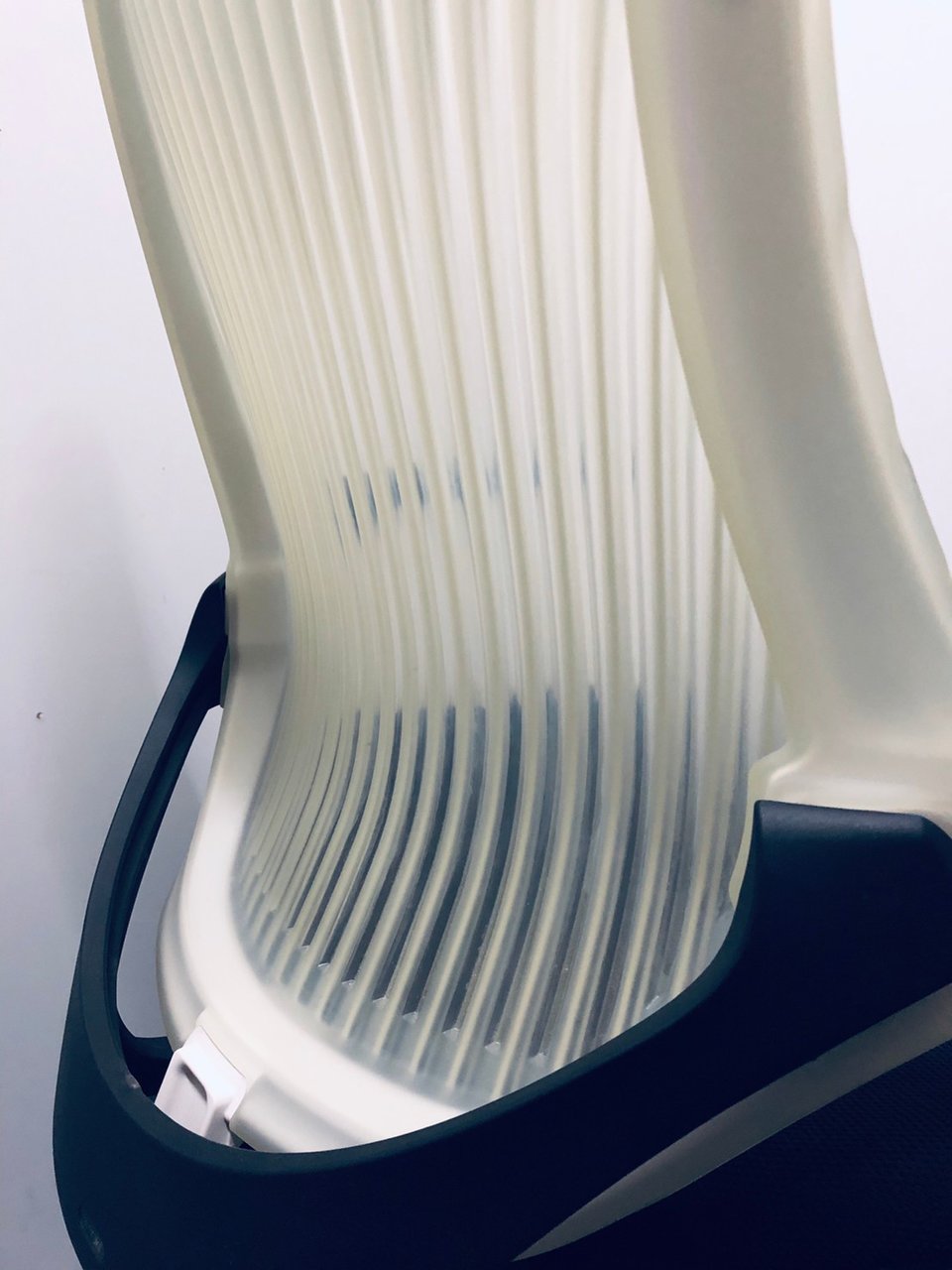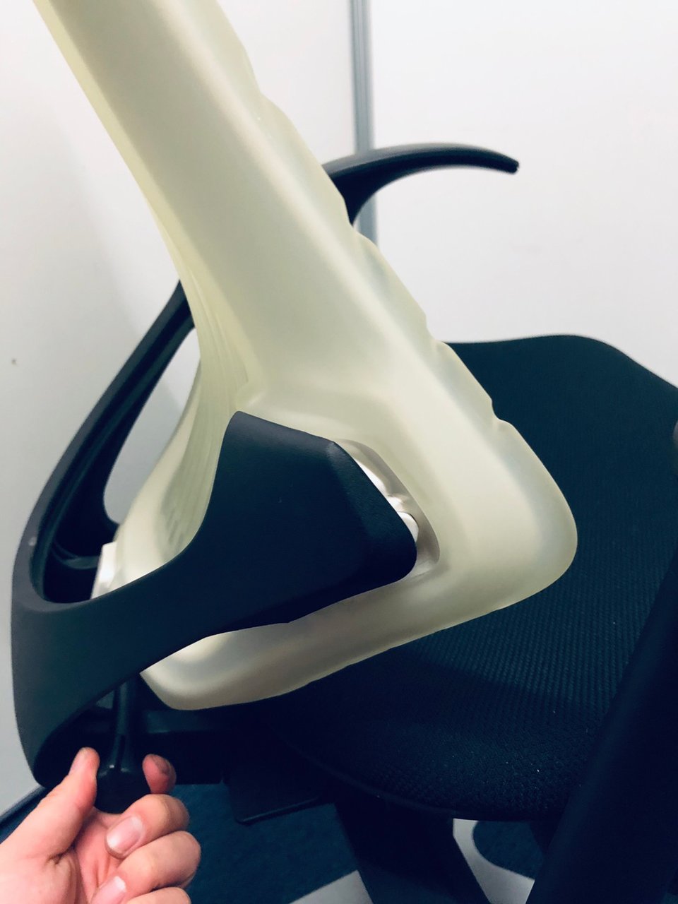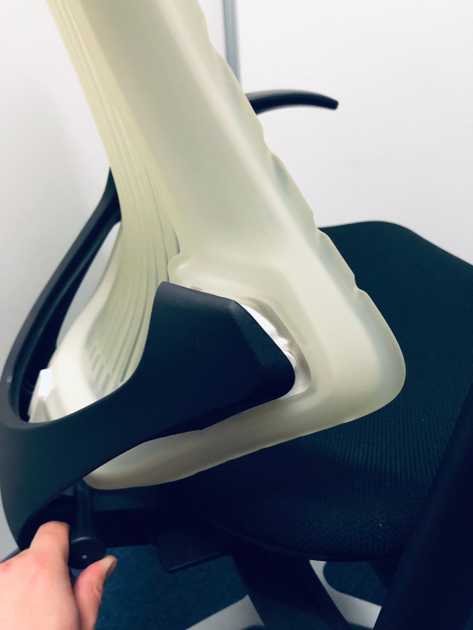- 座部のインナーシェル(芯材:ポリプロピレン樹脂製)には、最適な個所が着座荷重に応じて自在にたわむように多数のスリットを設けています。