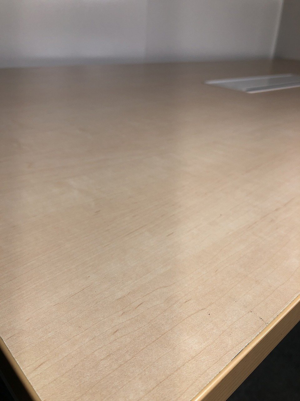 天板には、ペン跡などの傷がつき難いメラミン化粧板を使用しております。