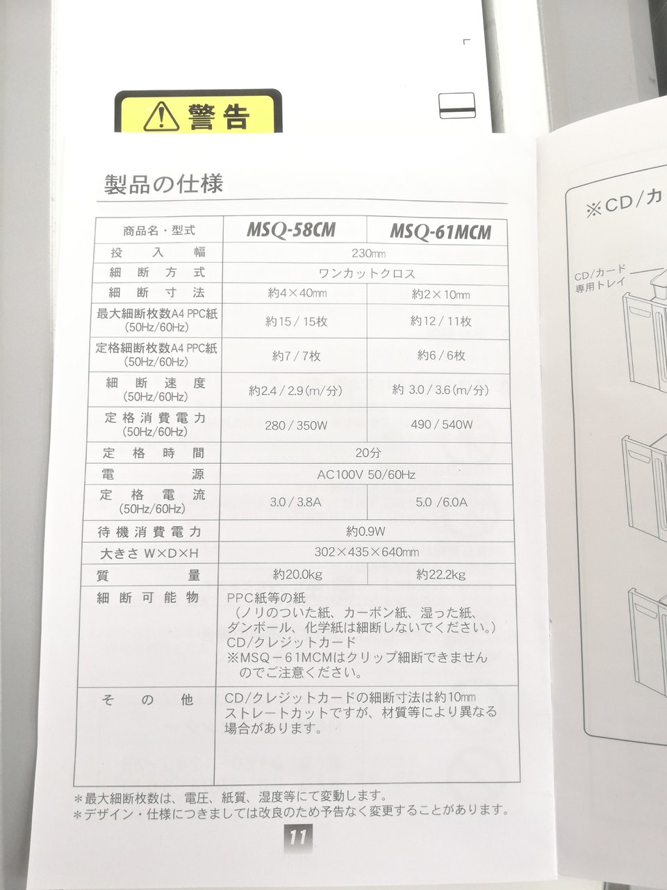 ・最大細断枚数:(50Hz/60Hz) 約15枚(新品時)