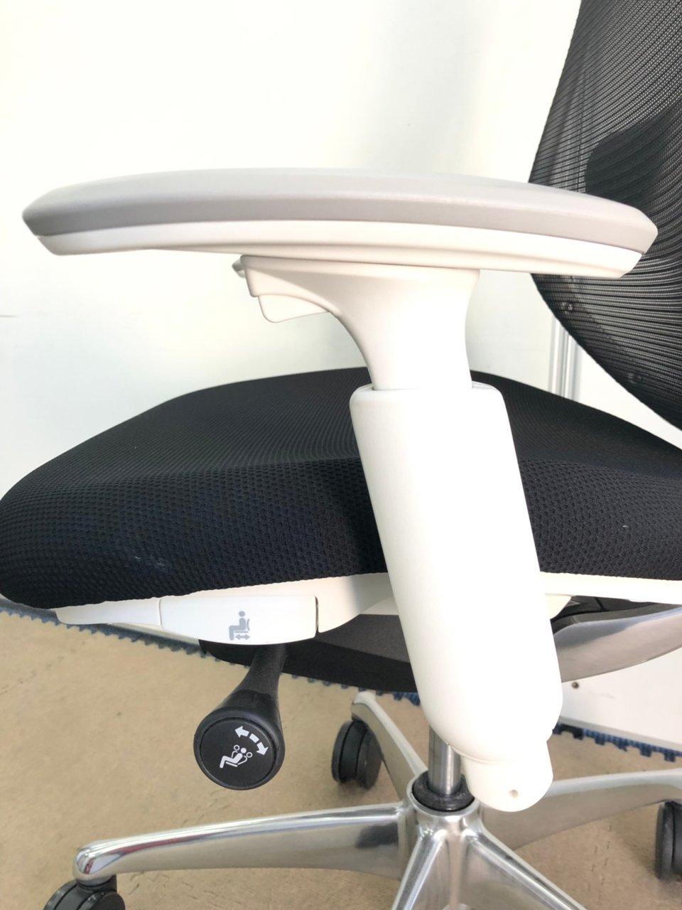 - 肘パッド部の上下(1D)、角度(2D)、前後(3D)、左右(4D)の調整が可能。可動幅は、上下100mm、内側20度、外側10度、前後40mm、左右片側25mmです。