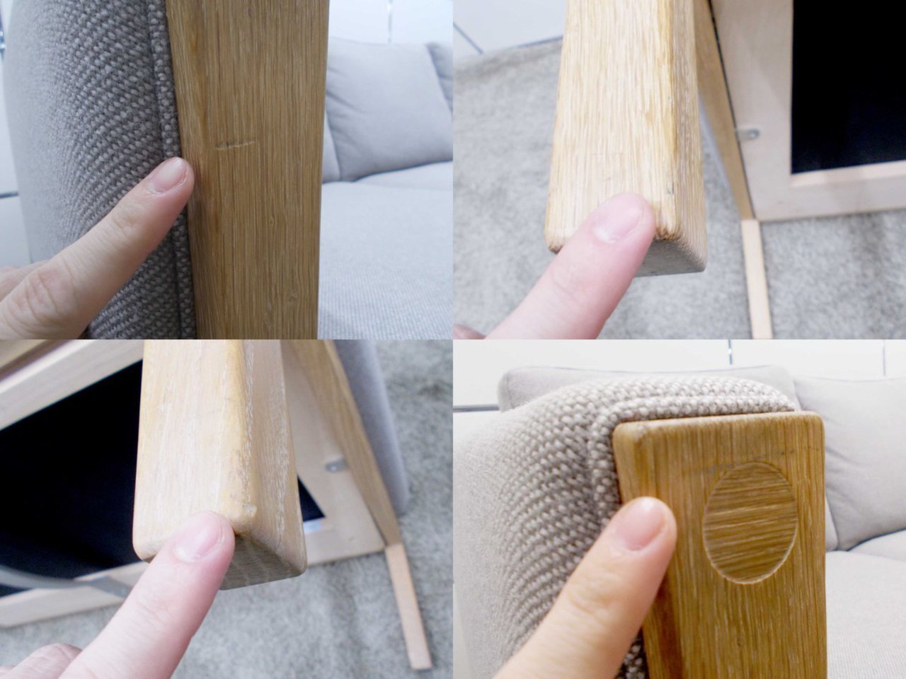 - あり黄ばみ・変色が広い範囲にうっすらある、または濃い黄ばみ・変色が一部ある。(例:三人用ソファ、二人用ソファ、一人用ソファの場合、背もたれ、肘かけ、座面等、 センターテーブルの場合、天板、脚にある。)