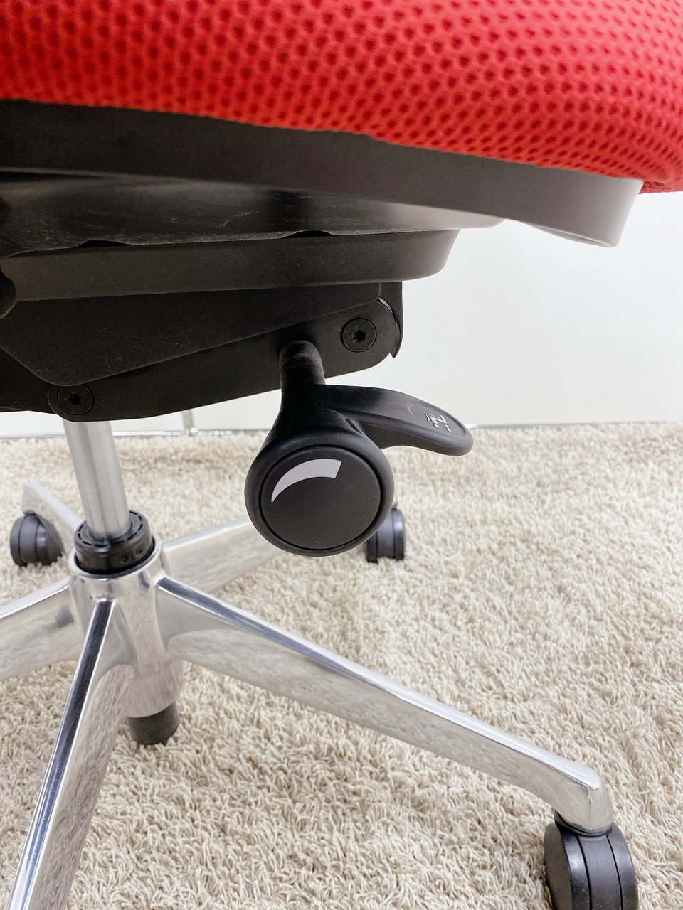 - 座面右下のダイヤル操作で、リクライニングの強弱調整が行えます。これまでのダイヤル式よりも、少ない回転数で、最弱?最強の調整が可能です。