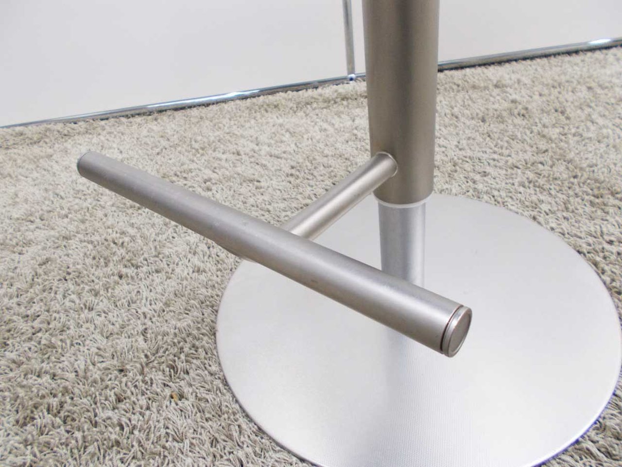 シートの薄さと洗練されたラインが特徴。本革の張り地で、上質な触り心地を演出し、ミニマルな造形に説得力を与えています。回転式で立ち座りがしやすく、ガススプリングにより、540mmから790mmまでの可動域で高さ調節も自在。フットレストも座面と一体で動くので腰と脚の位置関係は変わらず、快適な掛け心地を維持します。