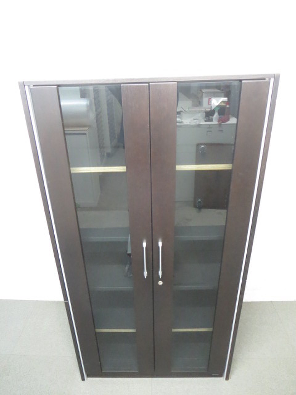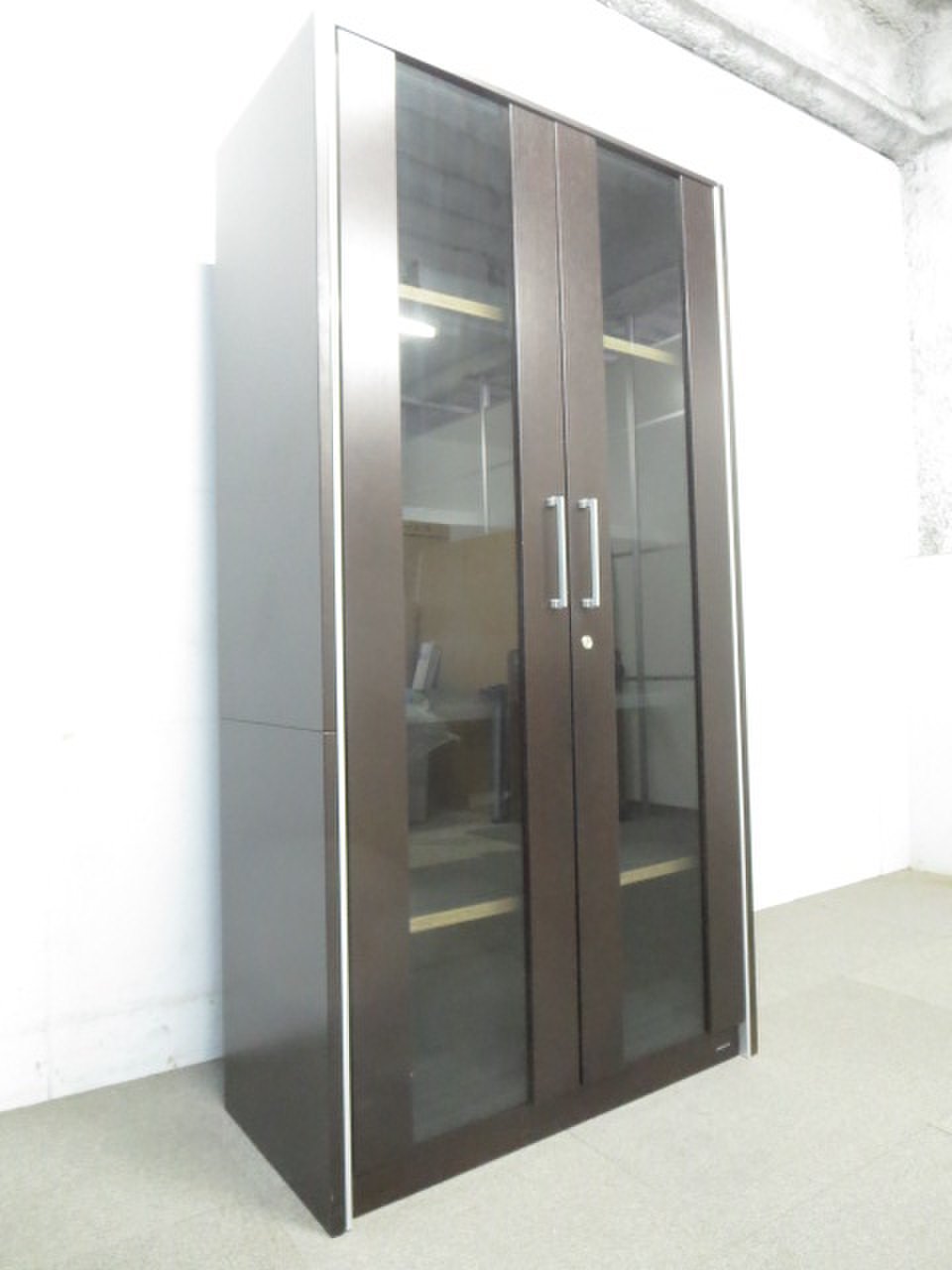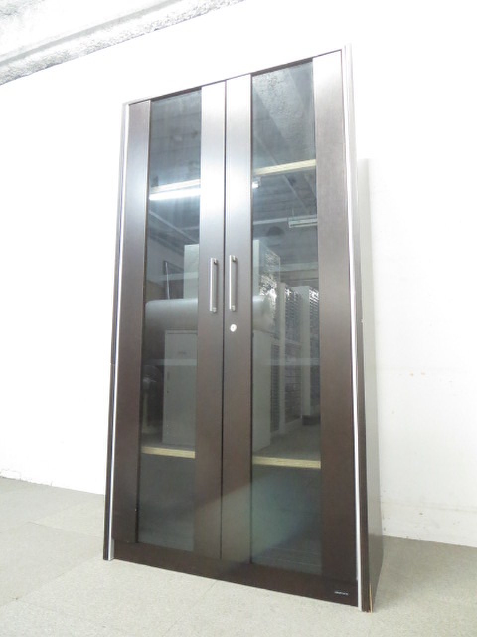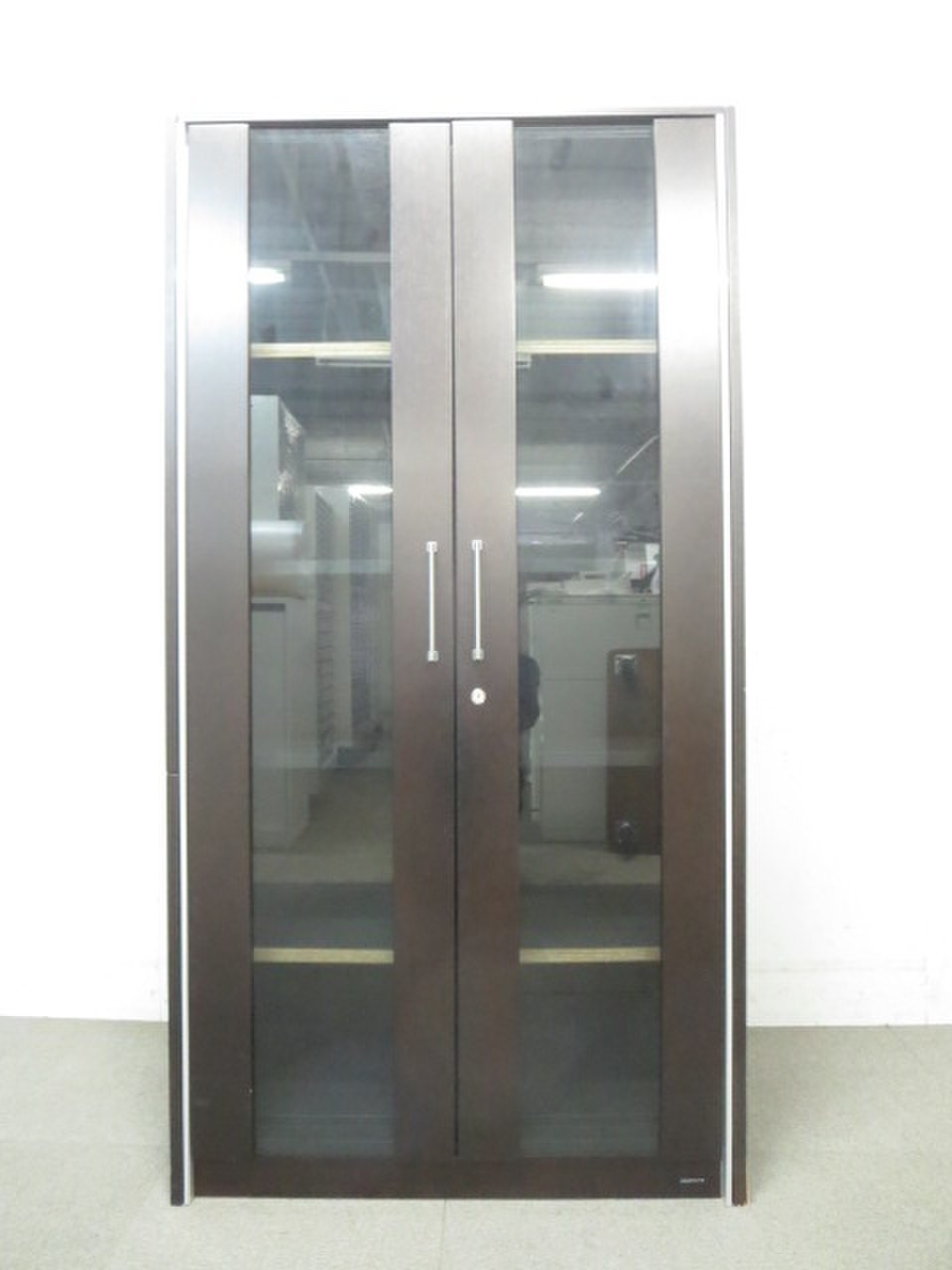 【役員室にオススメ!】■オカムラ製 木製ガラス書棚 ダークブラウン エンドパネル付【エグゼクティブ家具】- 川崎店