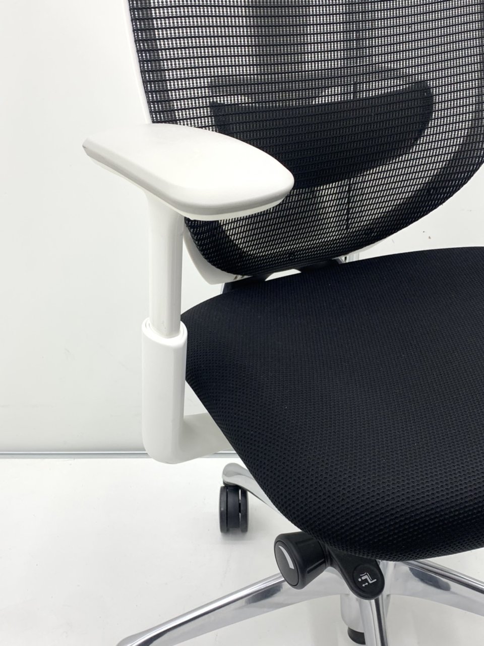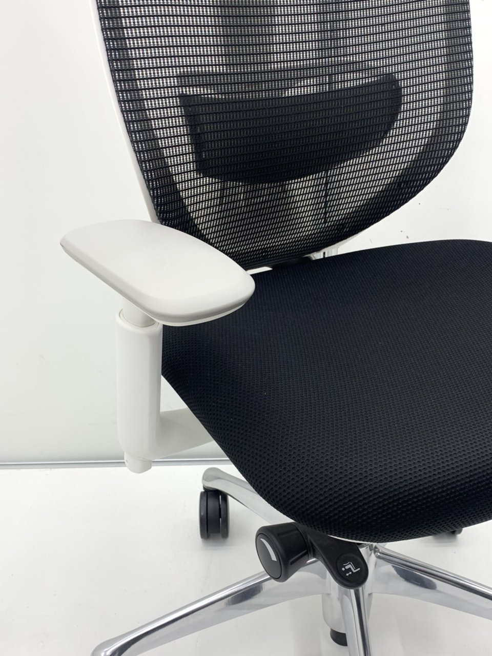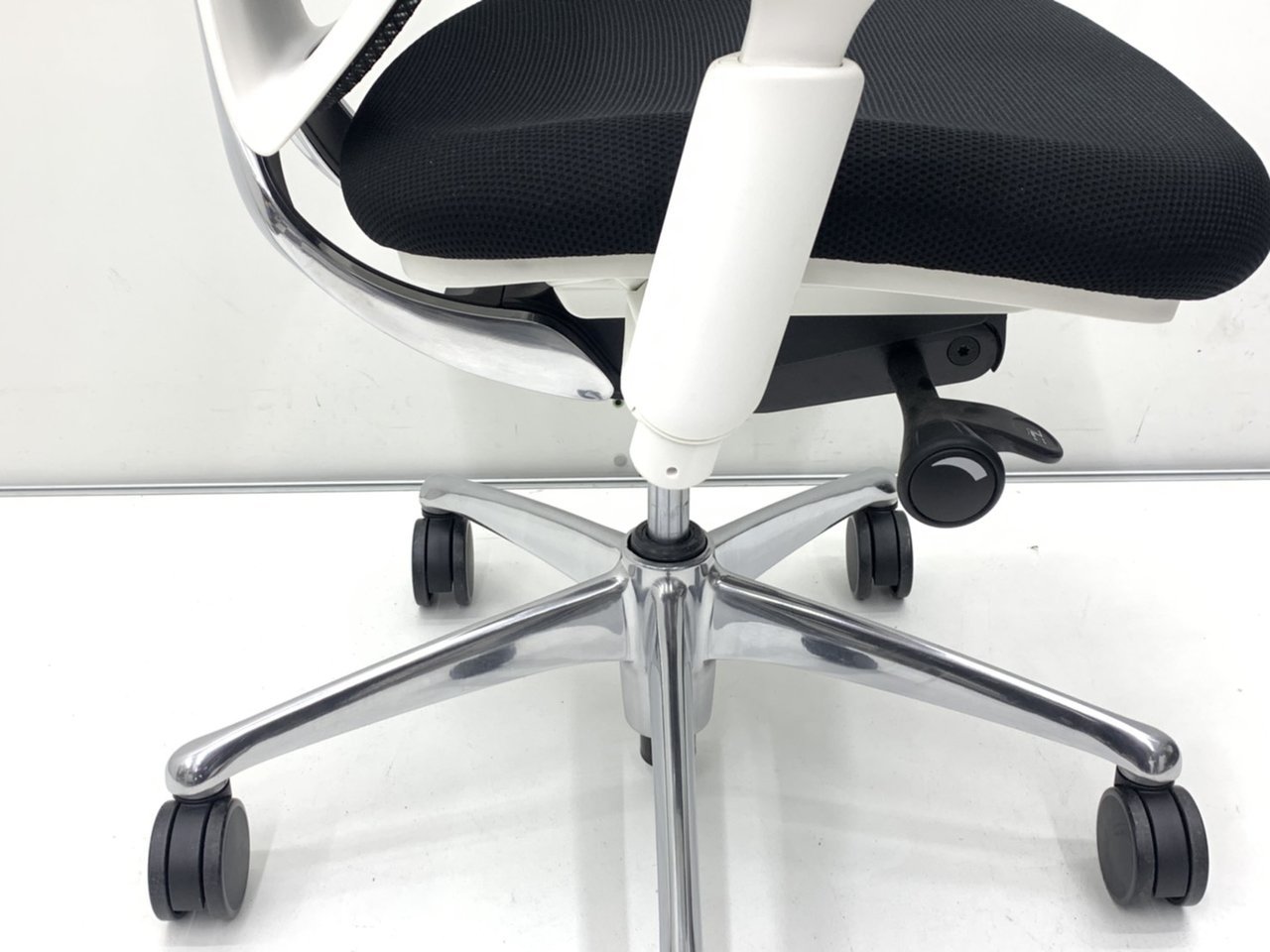 - 椅子と背が連動する「シンクロリクライニング」。リクライニング角度は直立ポジションから前方に10度、後方に23度です。
