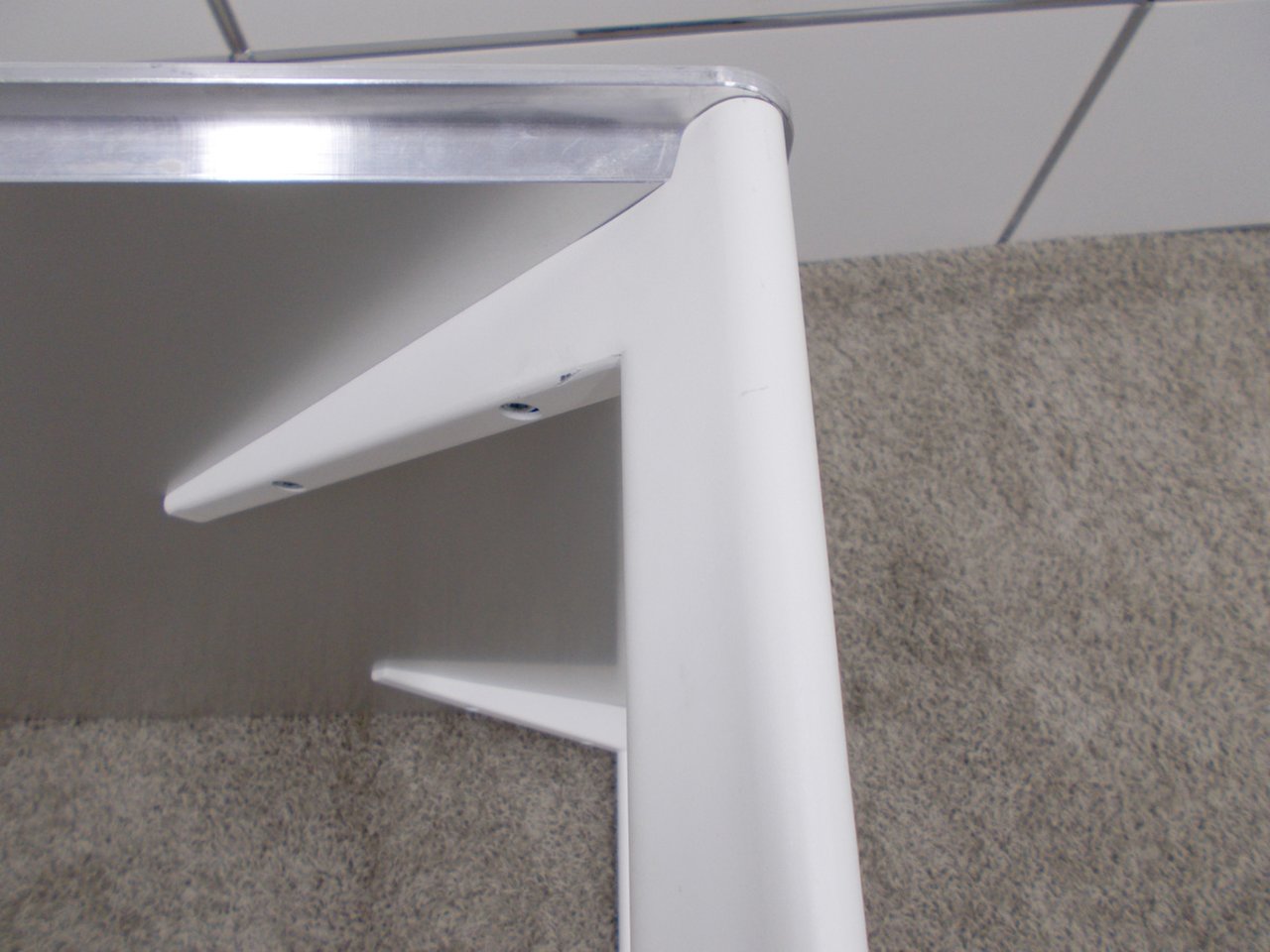 - 一部不具合あり天板歪み、アジャスター無し、キャスター使用不可ようなそのテーブルの本来の効用を果たすための機能以外の一部が使用不可な状態。(例、キャスターロッ ク機能使用不可、棚板無し等がある。)
