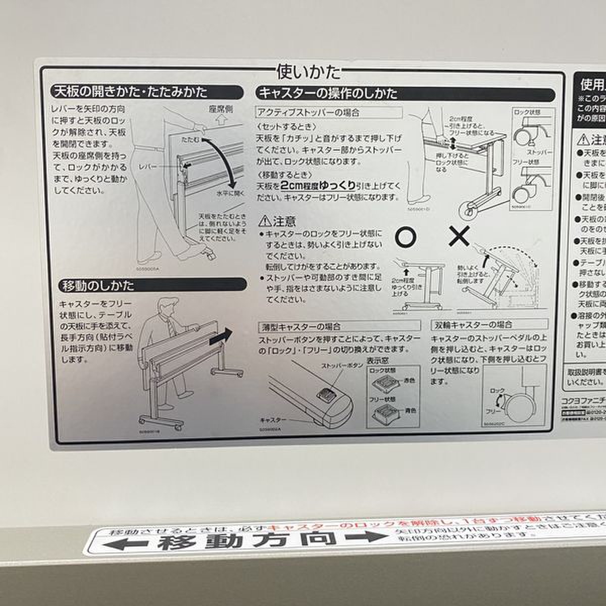 - 一部不具合あり天板歪み、アジャスター無し、キャスター使用不可ようなそのテーブルの本来の効用を果たすための機能以外の一部が使用不可な状態。(例、キャスターロッ ク機能使用不可、棚板無し等がある。)