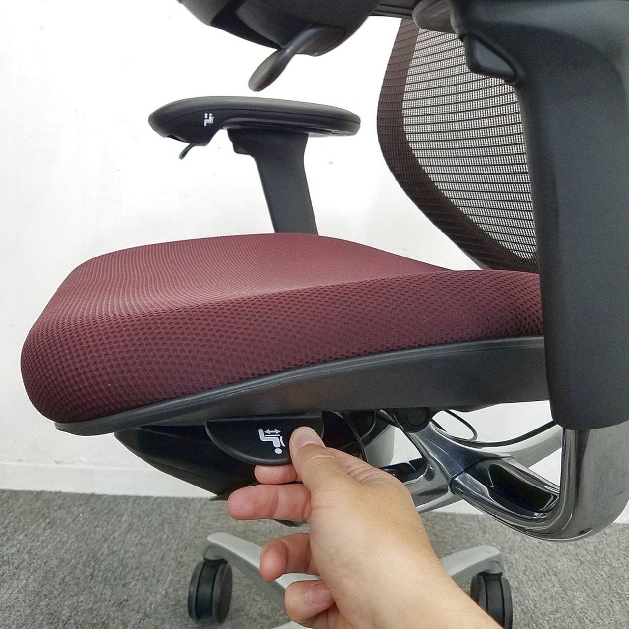 - 座面右下のレバーをスライドさせる「クイックスライドオペレーション」で、リクライニング反力を調整できます。強さの状態が視覚的にわかるため、直感的に操作がおこなえます。