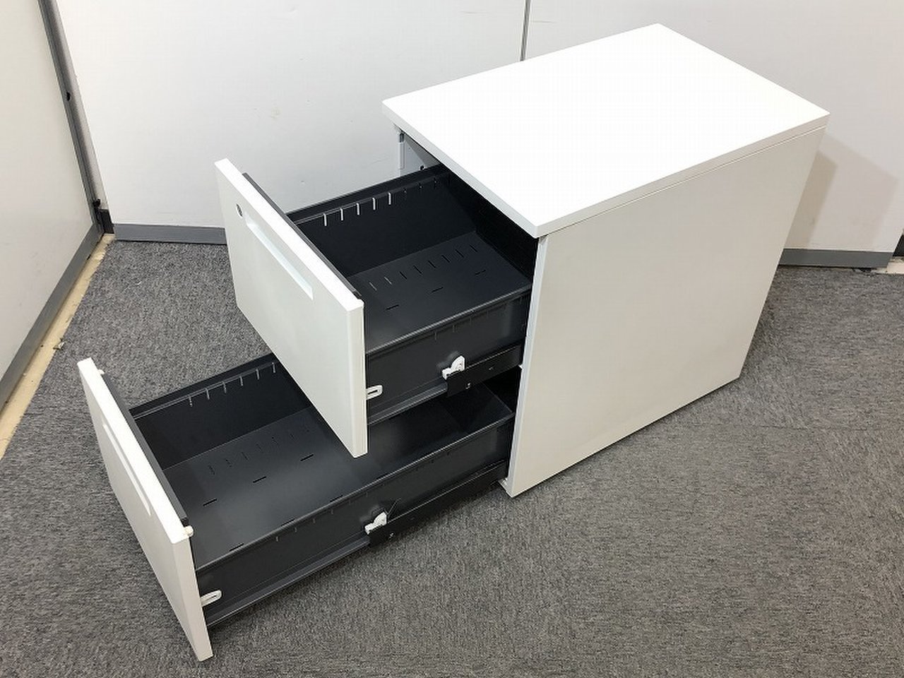- 一部不具合ありその脇机・ワゴンの本来の効用を果たすための機能以外の一部が使用不可な状態。(例、引出が開閉しづらい、 キャスターロック機能使用不可、ラッチ不良 等がある。)