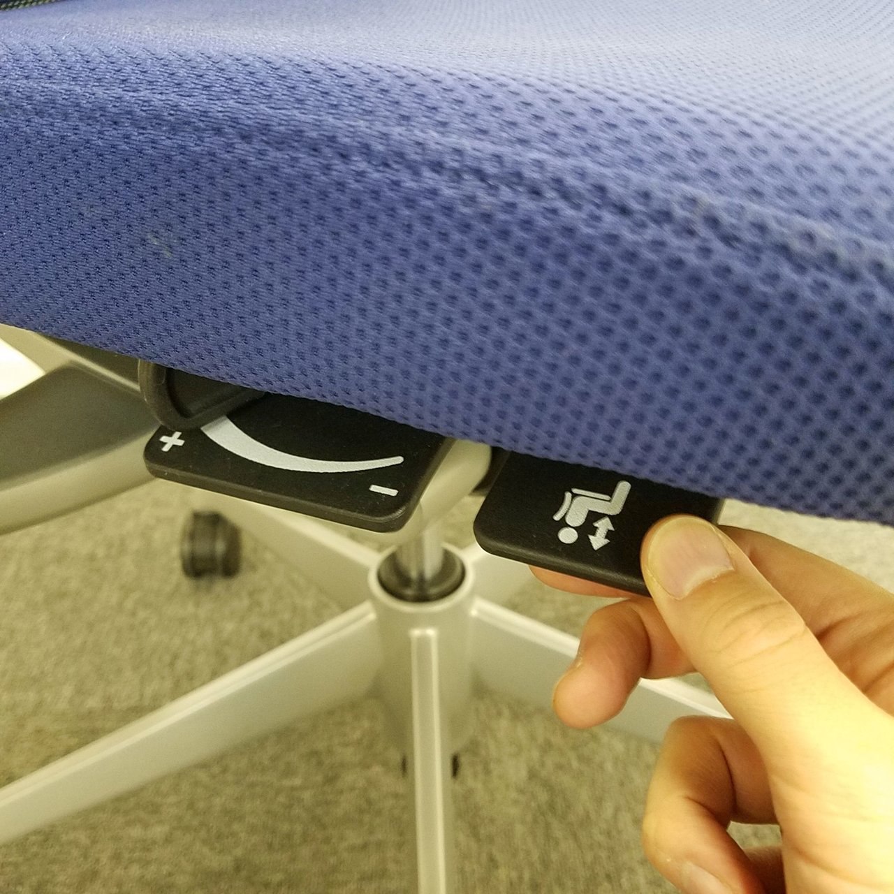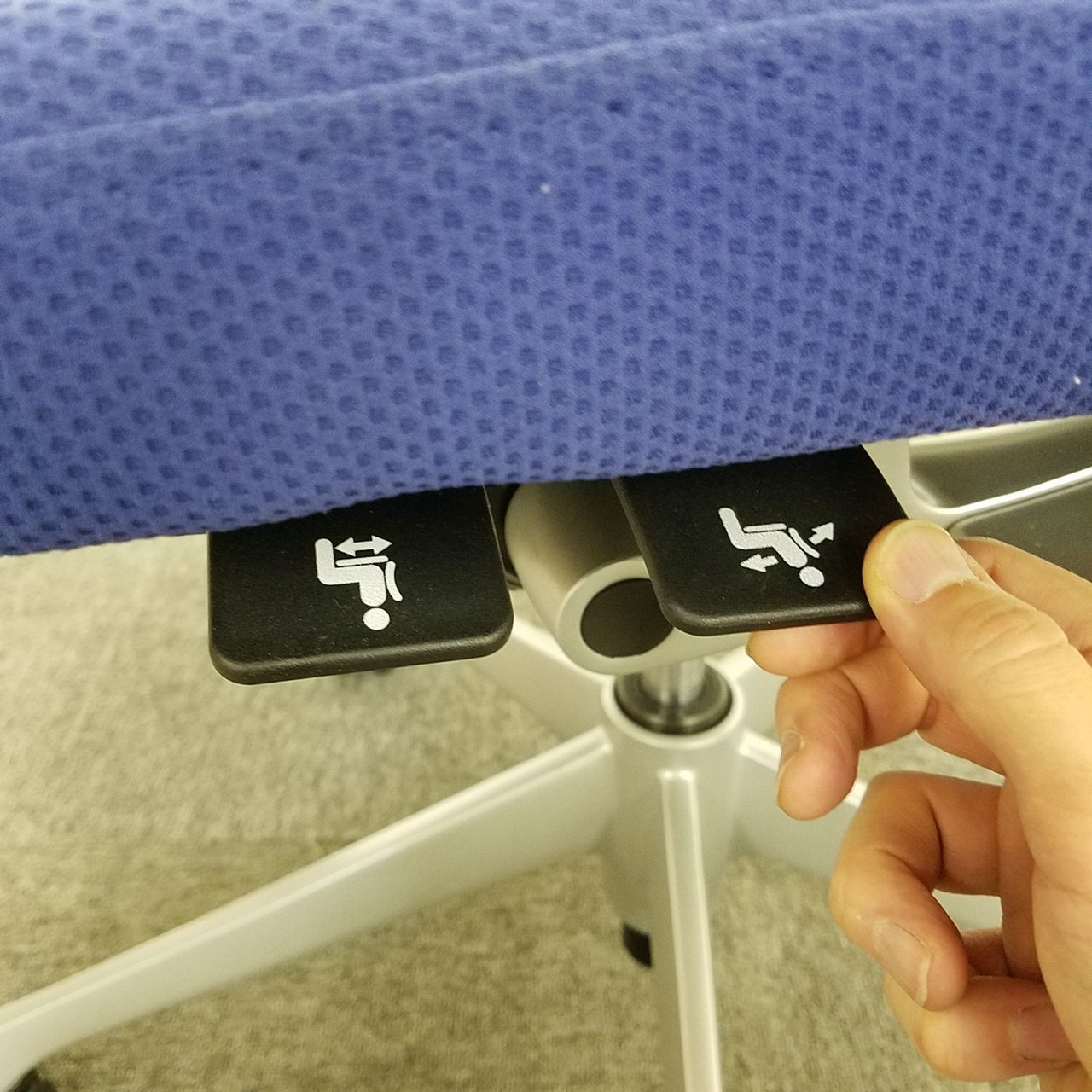 座面の高さや前後などの基本的な調整レバーが座面裏の前方に集約されており、姿勢を変えずに調節ができます。