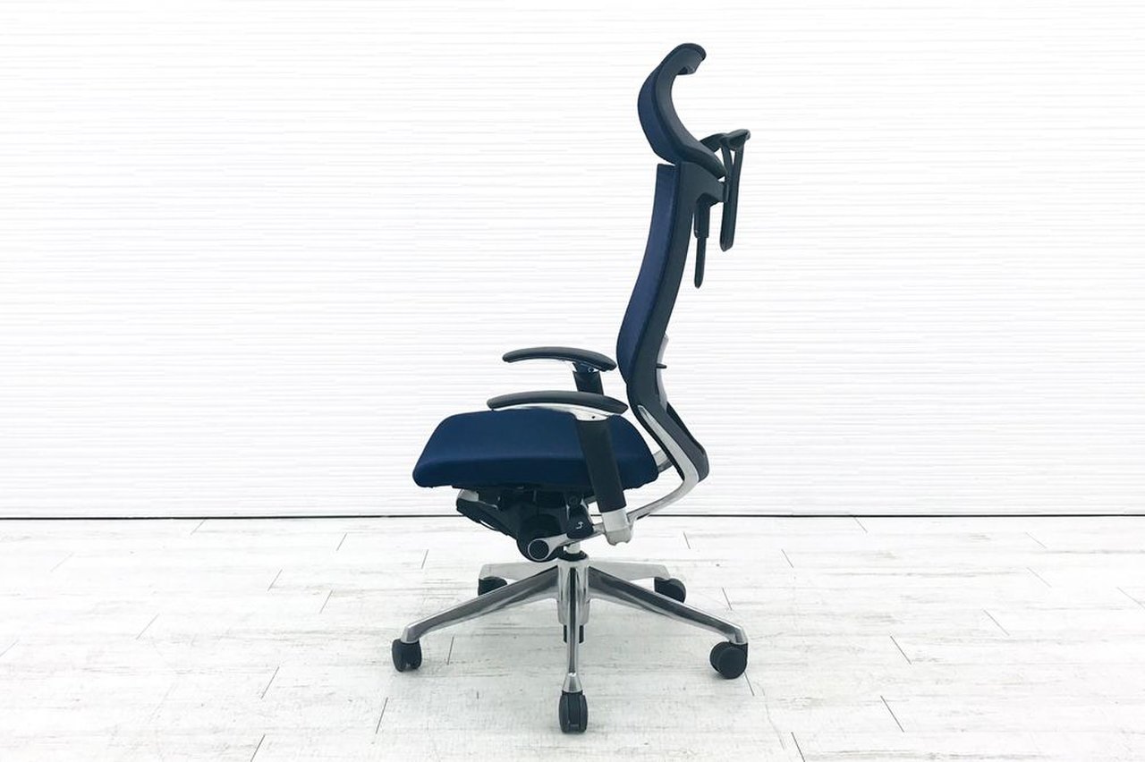 【定価15万以上~】岡村製の最高峰クラスのバロンチェア【ヘッドレスト付き】エクストラハイバック クッション/可動肘 /ポリッシュフレームフレーム/ダークブルー/ランバー付き- 足立・葛飾店