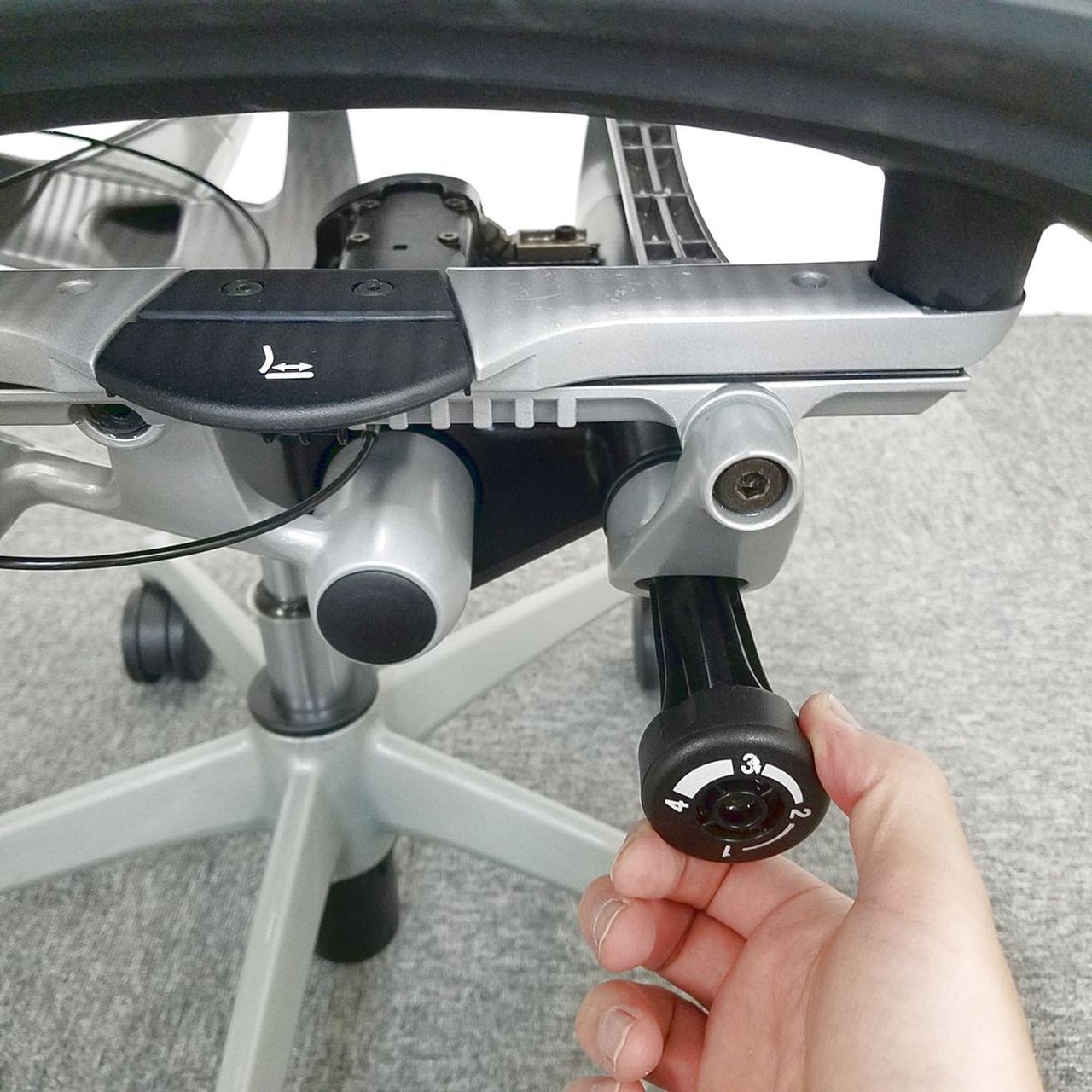 - ロッキングの強弱を調整するダイヤルがございます。体型に合わせてリクライニングの固さを座ったままで調整できます。
