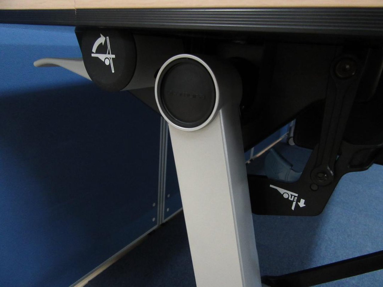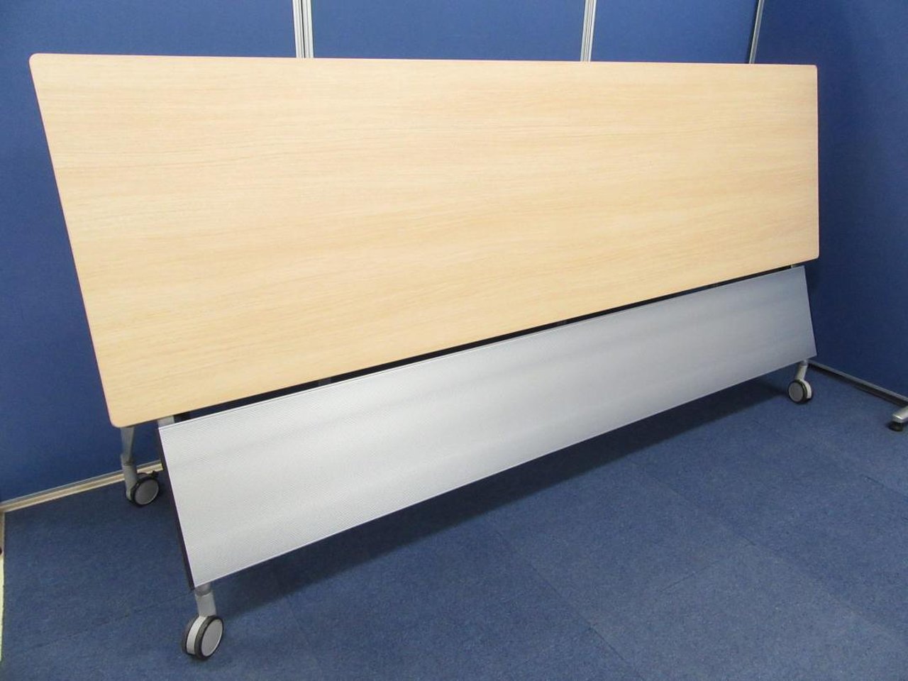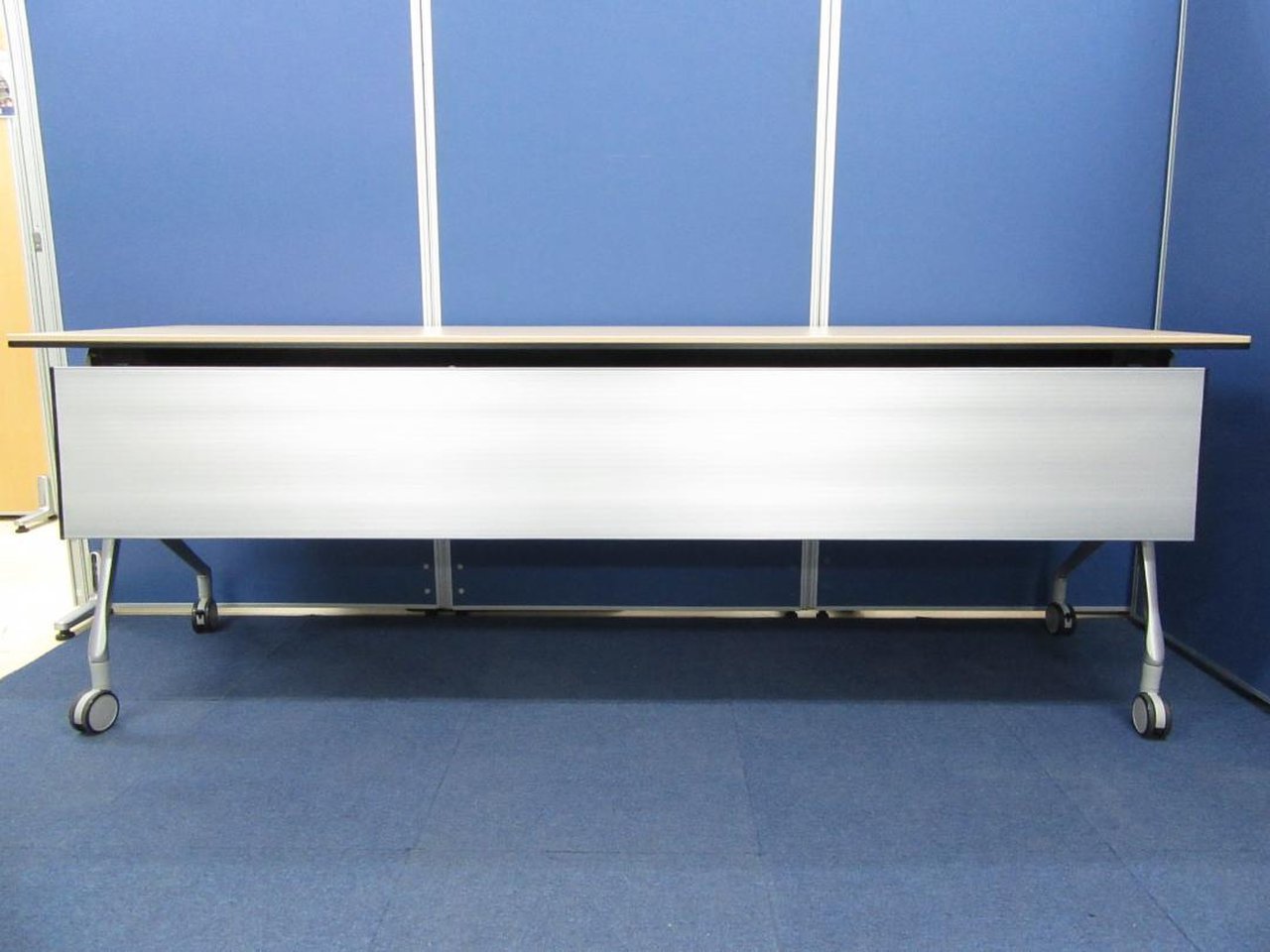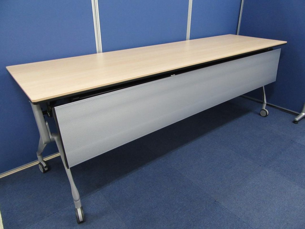 【シャープなフォルムがスタイリッシュ!】■オカムラ製 サイドフォールドテーブル ■W2100×D600mm ネオウッドライト 幕板パネル付【平行ネスティング】おつとめ品- 川崎店