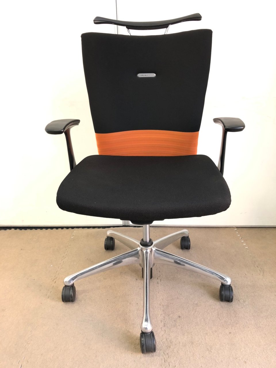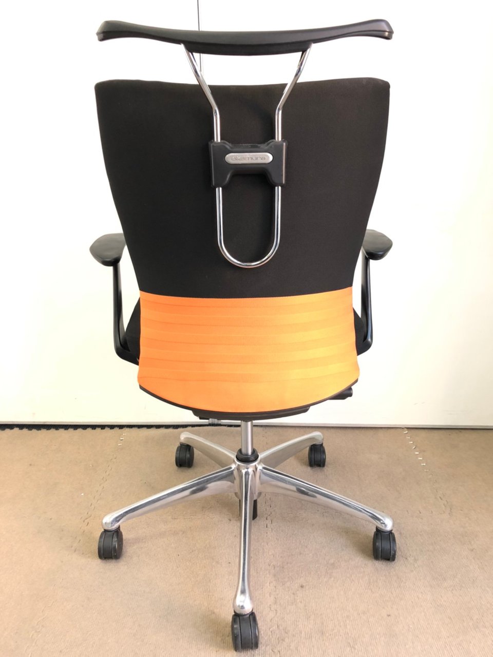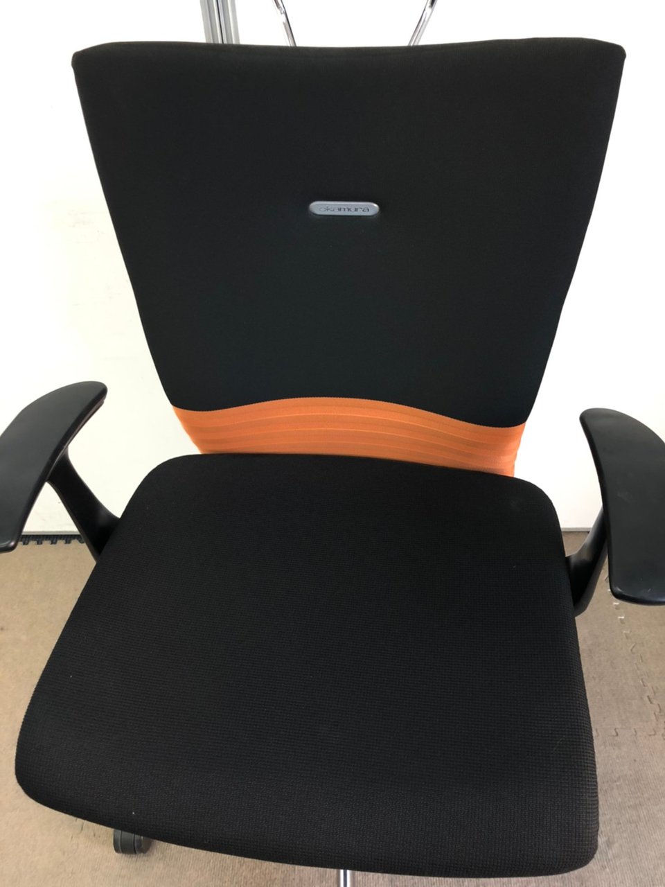 【人間工学に基づいた快適な座り心地!背あてのしなやかな曲線が背中にフィット!】■オカムラ製 フィーゴチェア (feego) 肘付きミドルバック シームレスタイプ ■固定肘 ■ブラック×オレンジ ※コートハンガー外し跡のある商品となります。【入替セールにつき30%OFF!】