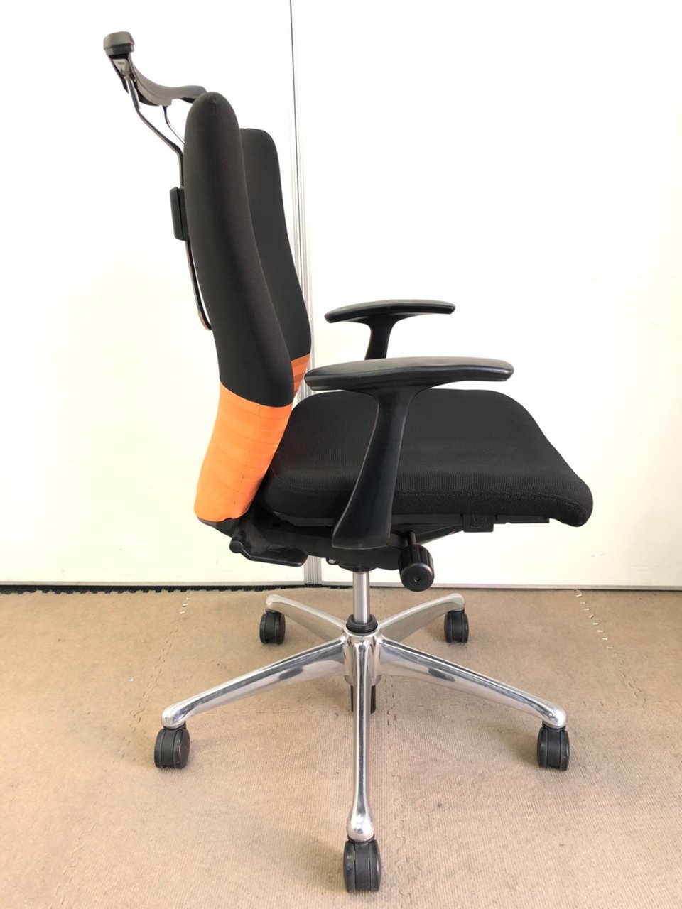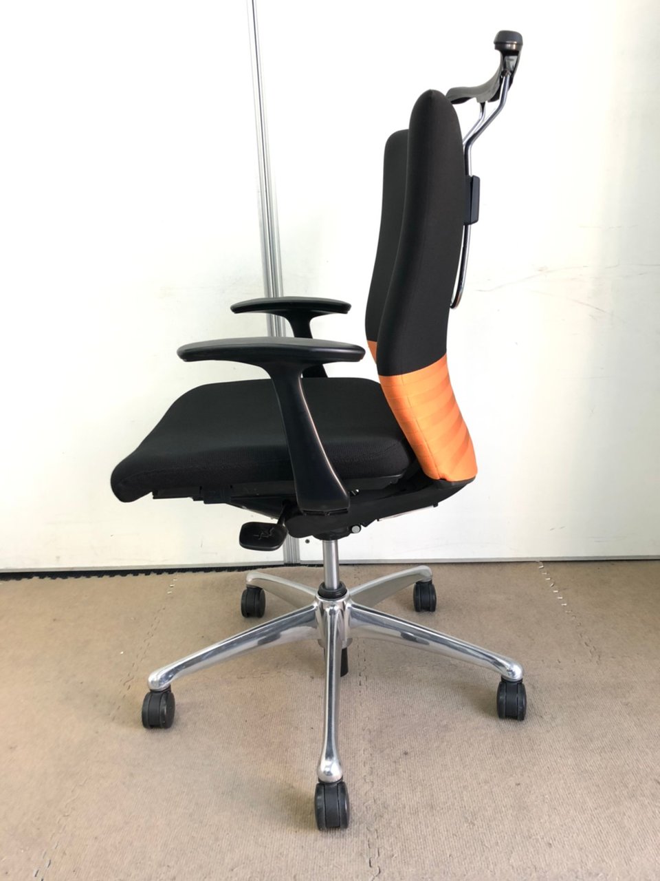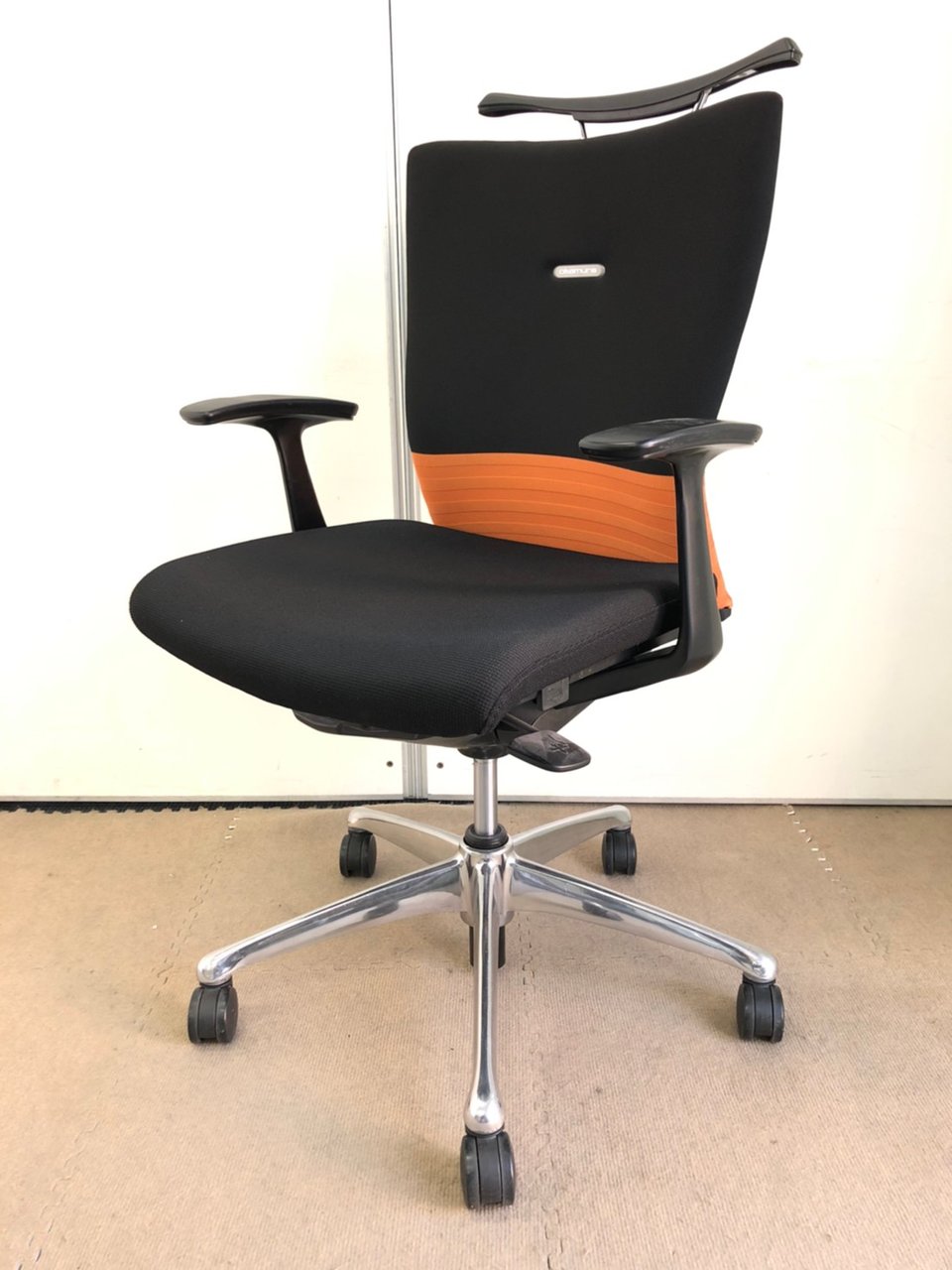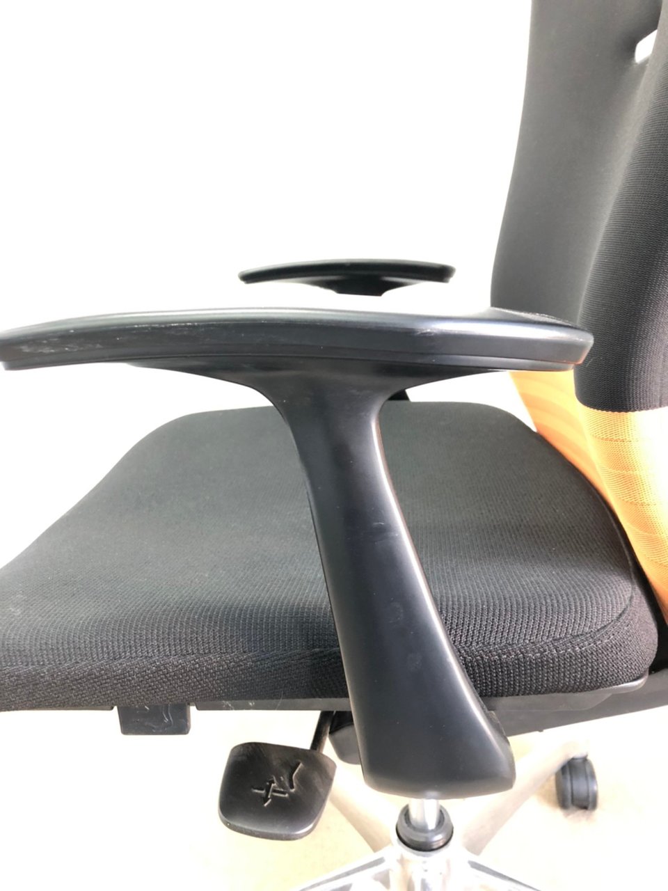 【人間工学に基づいた快適な座り心地!背あてのしなやかな曲線が背中にフィット!】■オカムラ製 フィーゴチェア (feego) 肘付きミドルバック シームレスタイプ ■固定肘 ■ブラック×オレンジ ※コートハンガー外し跡のある商品となります。【入替セールにつき30%OFF!】