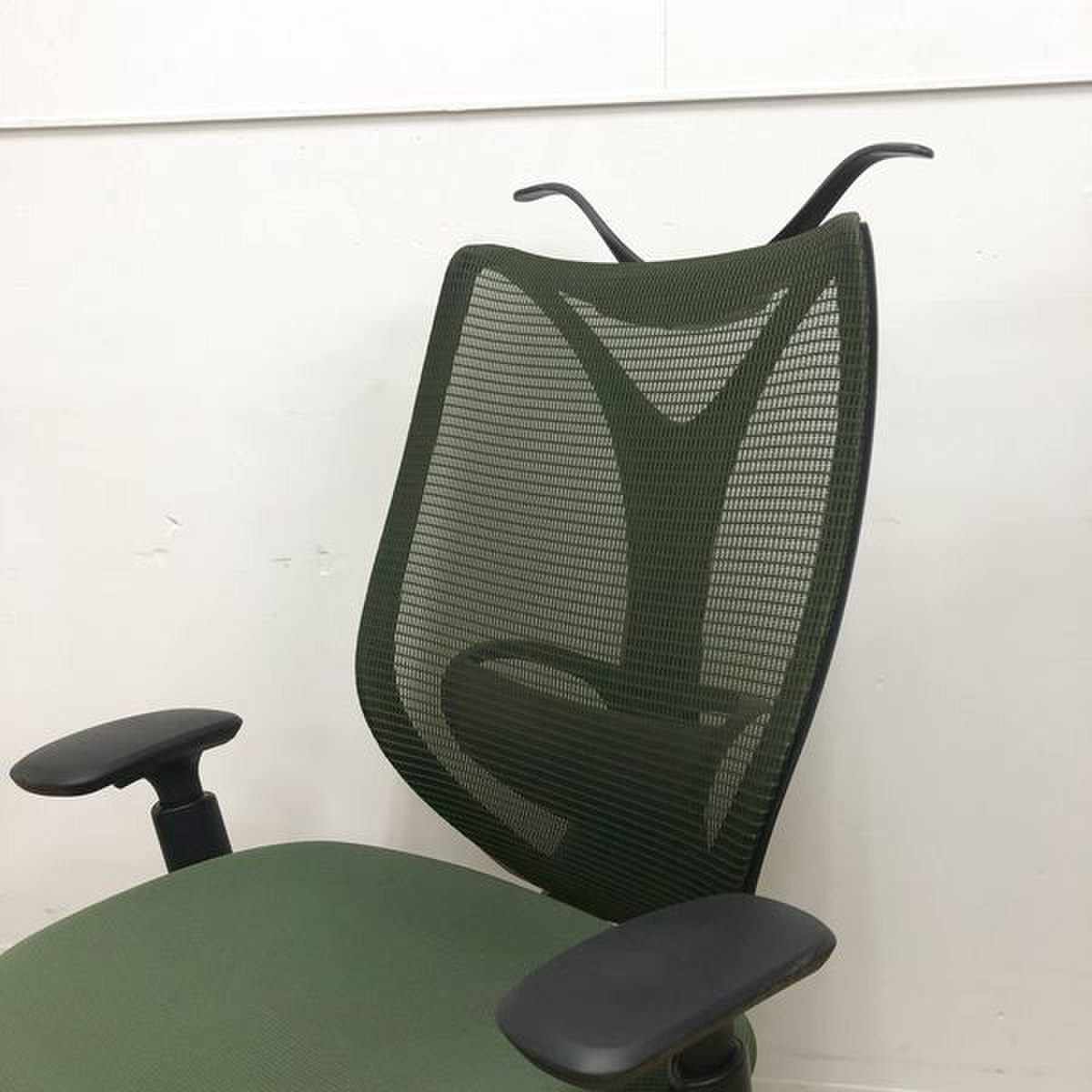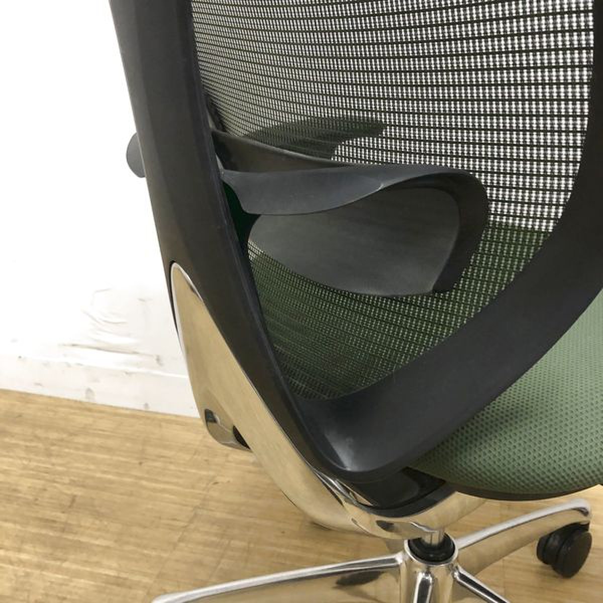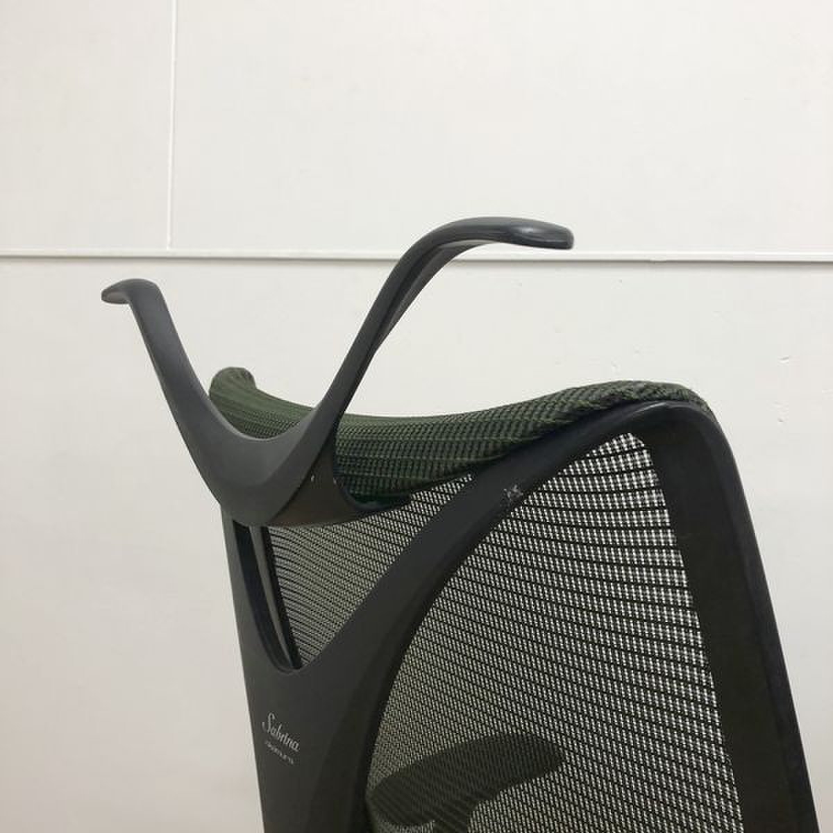【美しい曲線&透明感のあるメッシュ】■オカムラ製 サブリナチェア ダークグリーン アジャストアーム付 ホワイトボディ ハンガー付【※外部倉庫在庫品(店頭在庫無)】【BR】