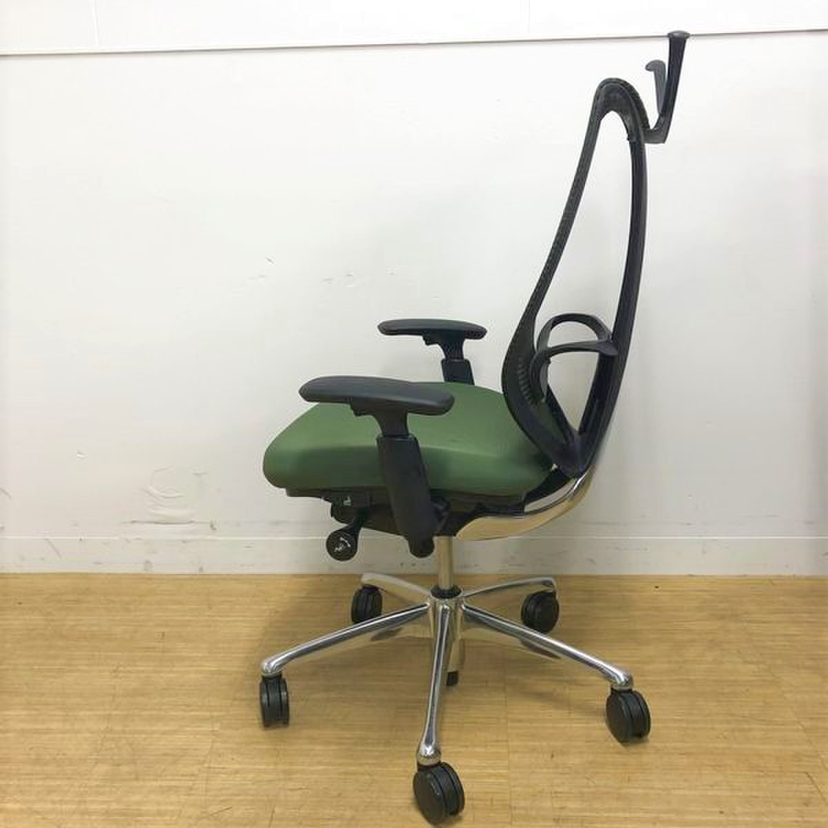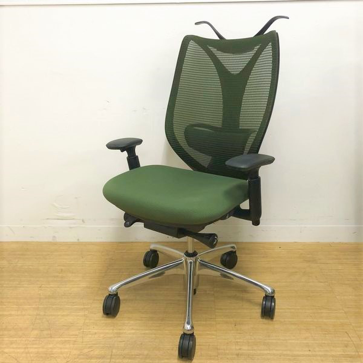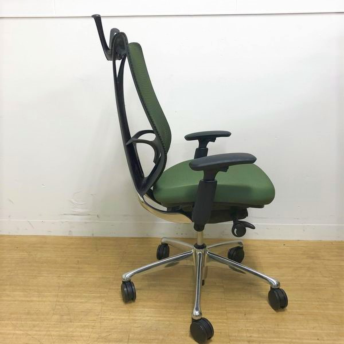 【美しい曲線&透明感のあるメッシュ】■オカムラ製 サブリナチェア ダークグリーン アジャストアーム付 ホワイトボディ ハンガー付【※外部倉庫在庫品(店頭在庫無)】【BR】