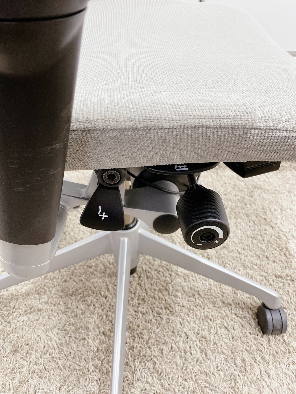 気に入っているのはリクライニング調整の自由さです。同じオカムラ社製の上位モデルや下位モデルも、角度が5段階程度の固定位置だったり、リクライニング強度も4段階だったりしますが、バロンチェアはどちらも無段階。つまり完全に好きな位置、好きな強度に調整することができます。