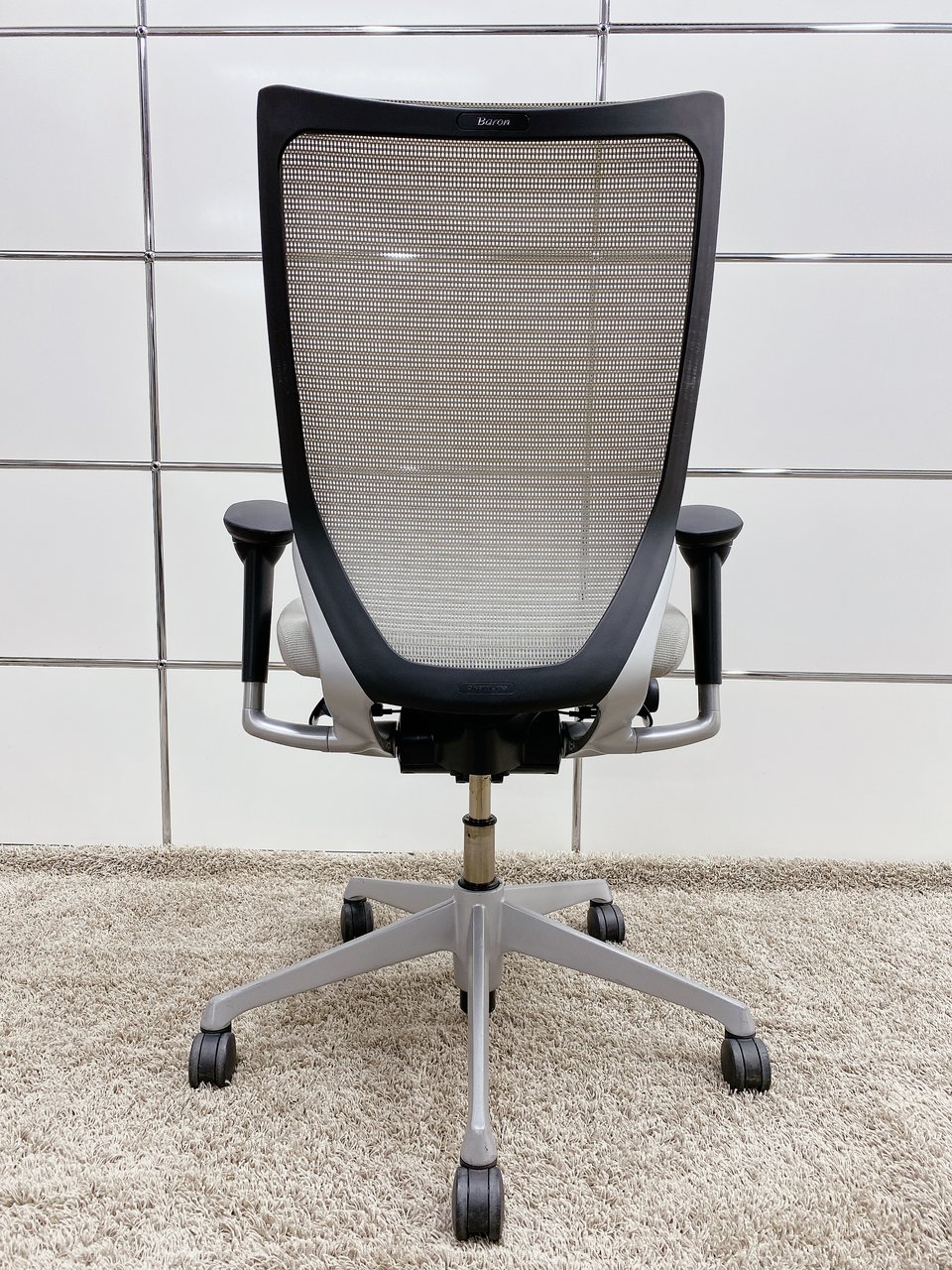 発売当時、既に人気を博していたオカムラの高級チェア、コンテッサから手元で座高調整ができるスマートオペレーション機能を取り除くなどしてリーズナブルにしたのがバロンです。その際に少しだけコンパクト化されました。そのことが、日本人の体格、日本のオフィス、家庭環境に適し、国内で多くのシェアを獲得する要因の一つになったのではないかと思います。