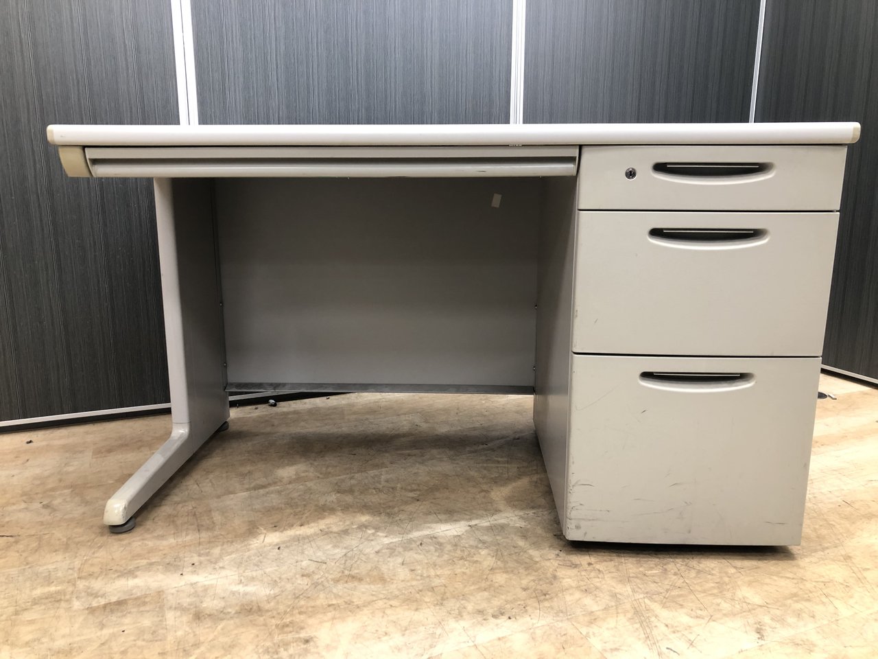 【オカムラの超定番シリーズ!袖一体型で書類をたっぷり収納可能!】■オカムラ (okamura)製 SD-Vシリーズ 片袖机 W1200mm×D700mm ■シリンダー錠 ■ライトグレー ※日焼け有【弊社使用欄:A01034077】