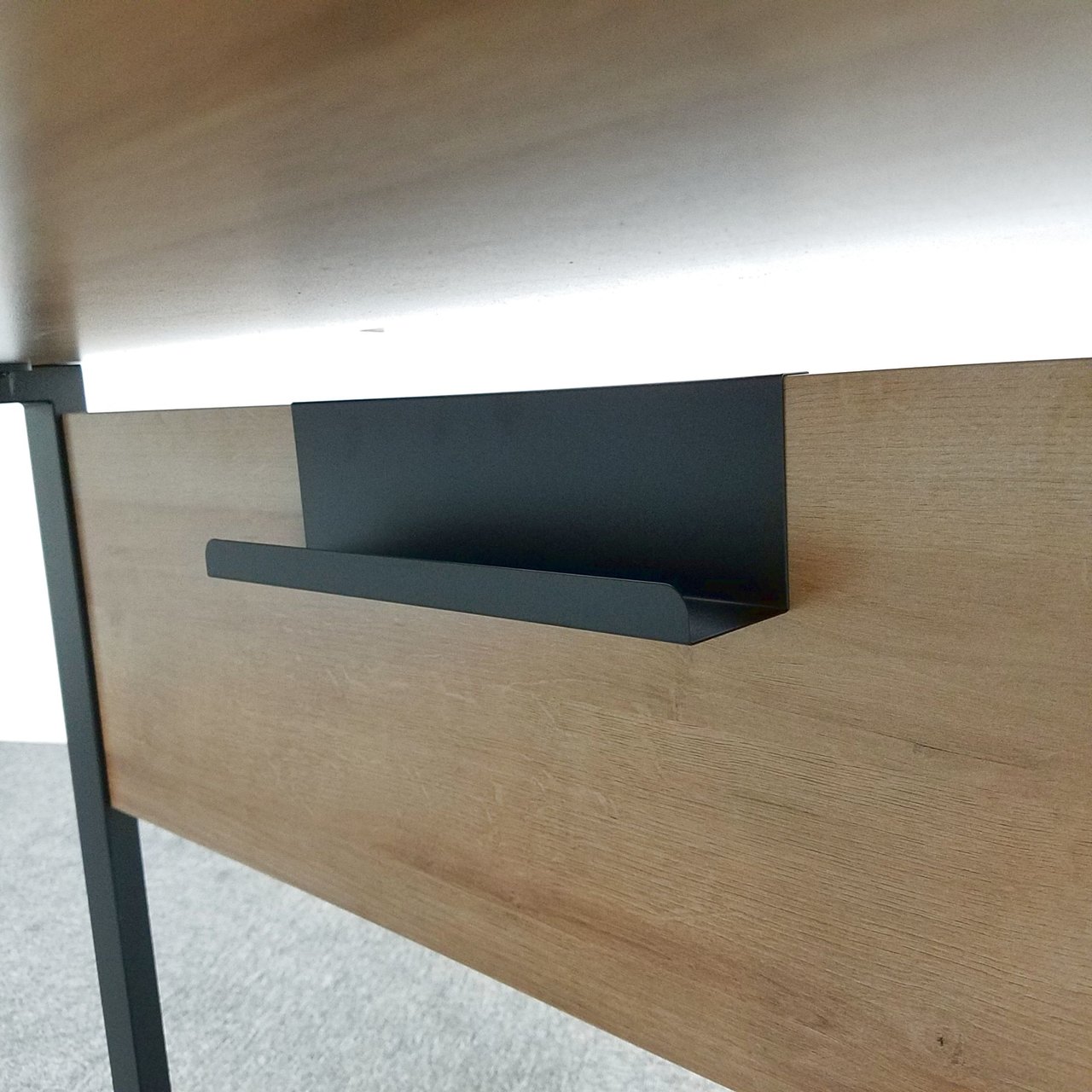 OAタップや延長コードが収納出来るようにスチール製の配線トレーが御座います。