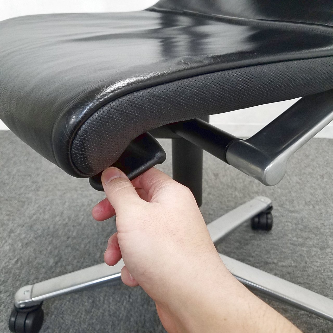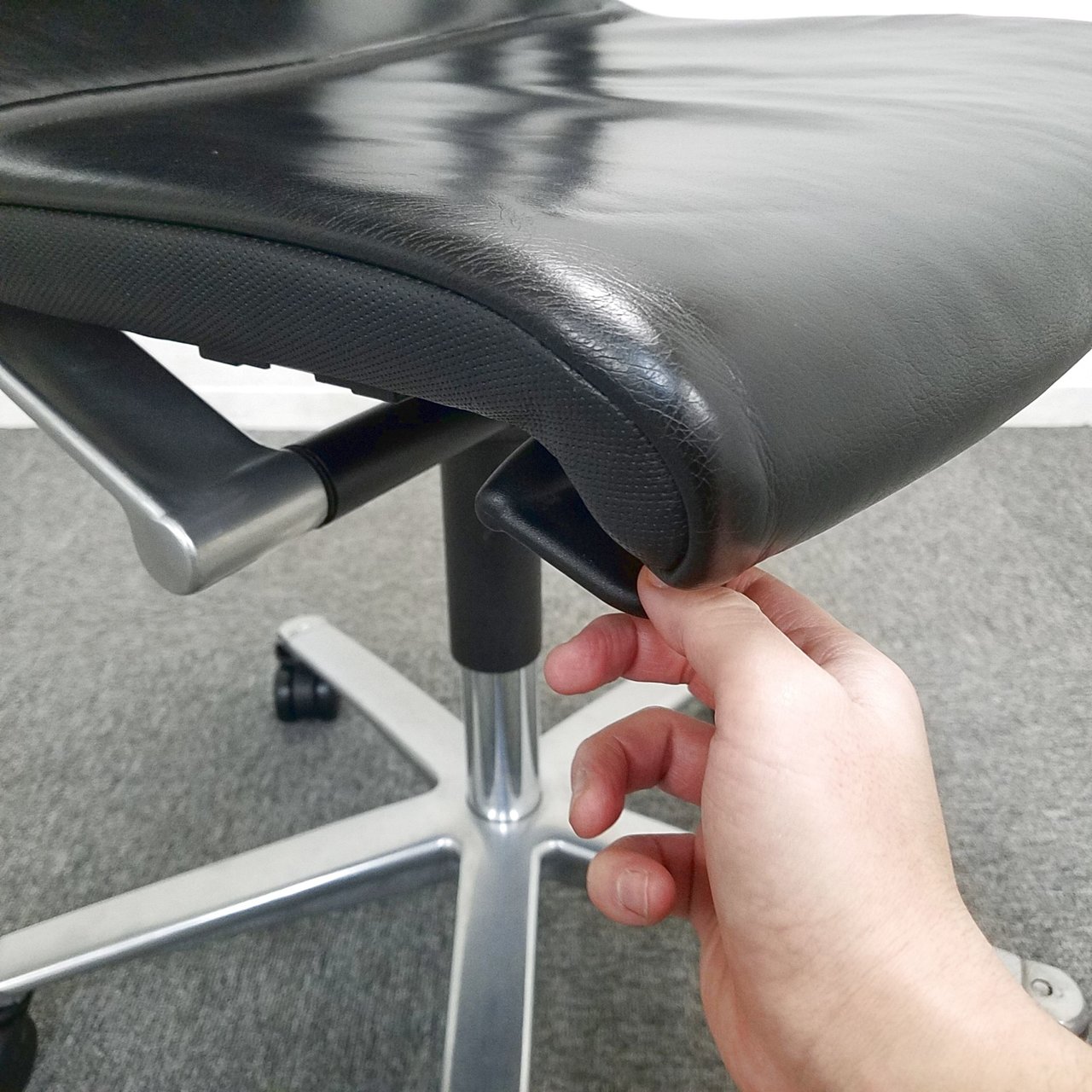 座面右前下のレバーにより、100mmの範囲で座面が上下に昇降し、高さ調節が可能です。