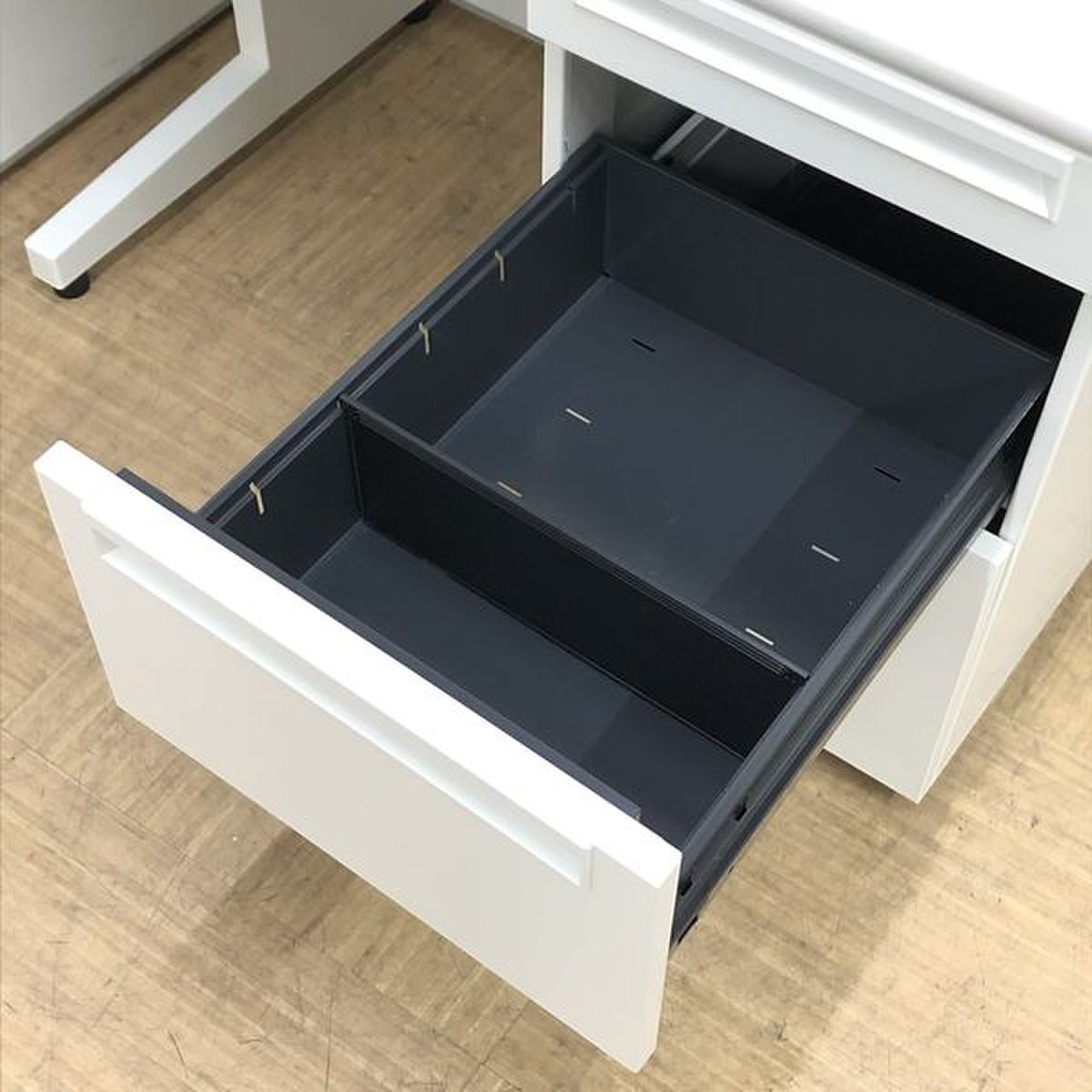 定番の幅1200㎜サイズと程よい大きさで、袖付なので小物や資料の収納も可能です。