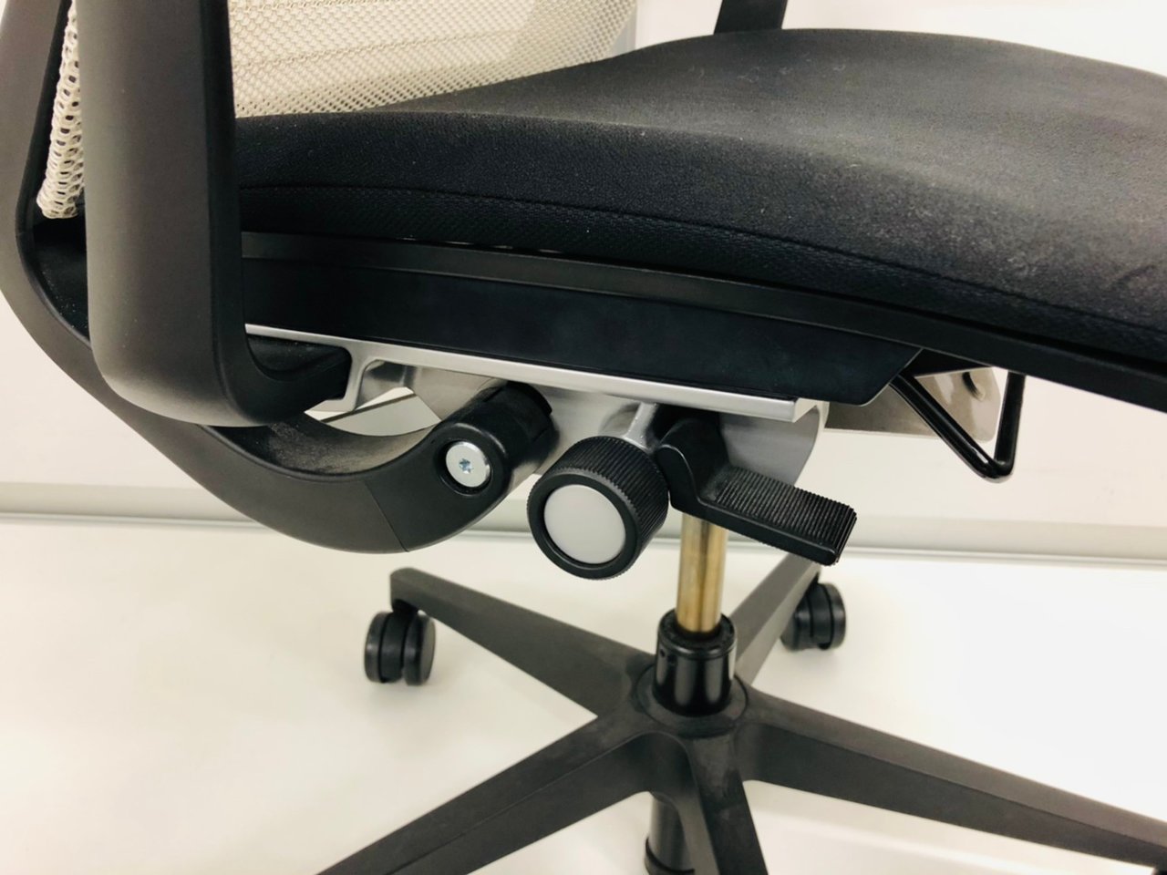 快適な座り心地に不可欠な調節機能である、上下昇降、座面の奥行き調整、リクライニングなどを備えており、操作もわかりやすく好評です。 特に、座面の奥行きは、座面下の左右に通った細いバーで調整でき、座ったままで軽やかに滑るように調整が可能です。 価格面では、新品では高めですが、中古は流通も多く、定価の3割前後の価格で高級チェアの座り心地を手に入れることができます!