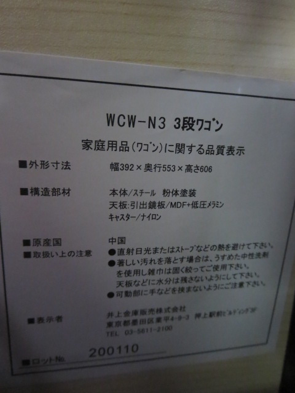 【中古】 WCW-N3-NA 井上金庫 ワゴン3段 313483
