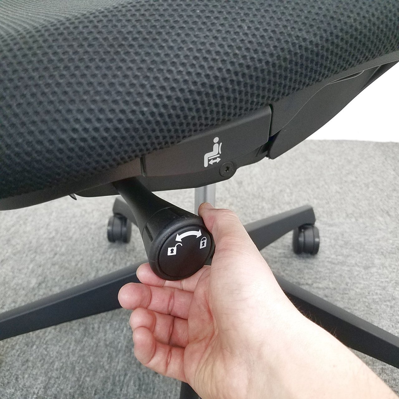 - 座面の左にあるレバー操作により、座面の奥行き調整が可能です。(ストローク:50mm)