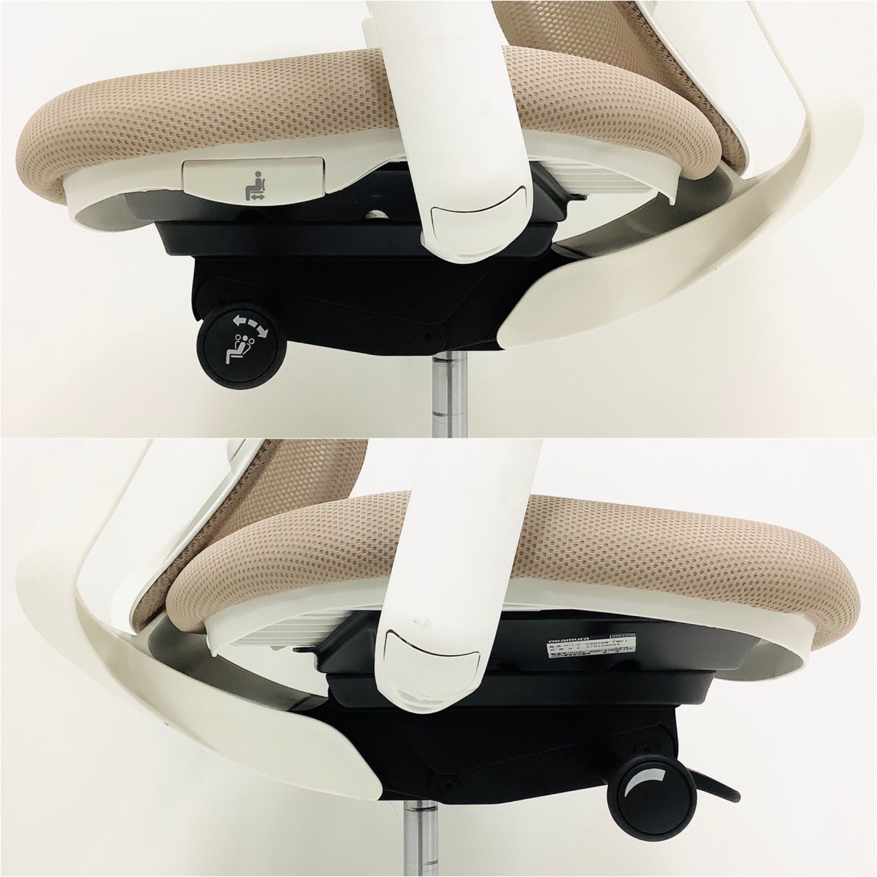 - 座面右下のダイヤル操作で、リクライニングの強弱調整が行えます。これまでのダイヤル式よりも、少ない回転数で、最弱?最強の調整が可能です。
