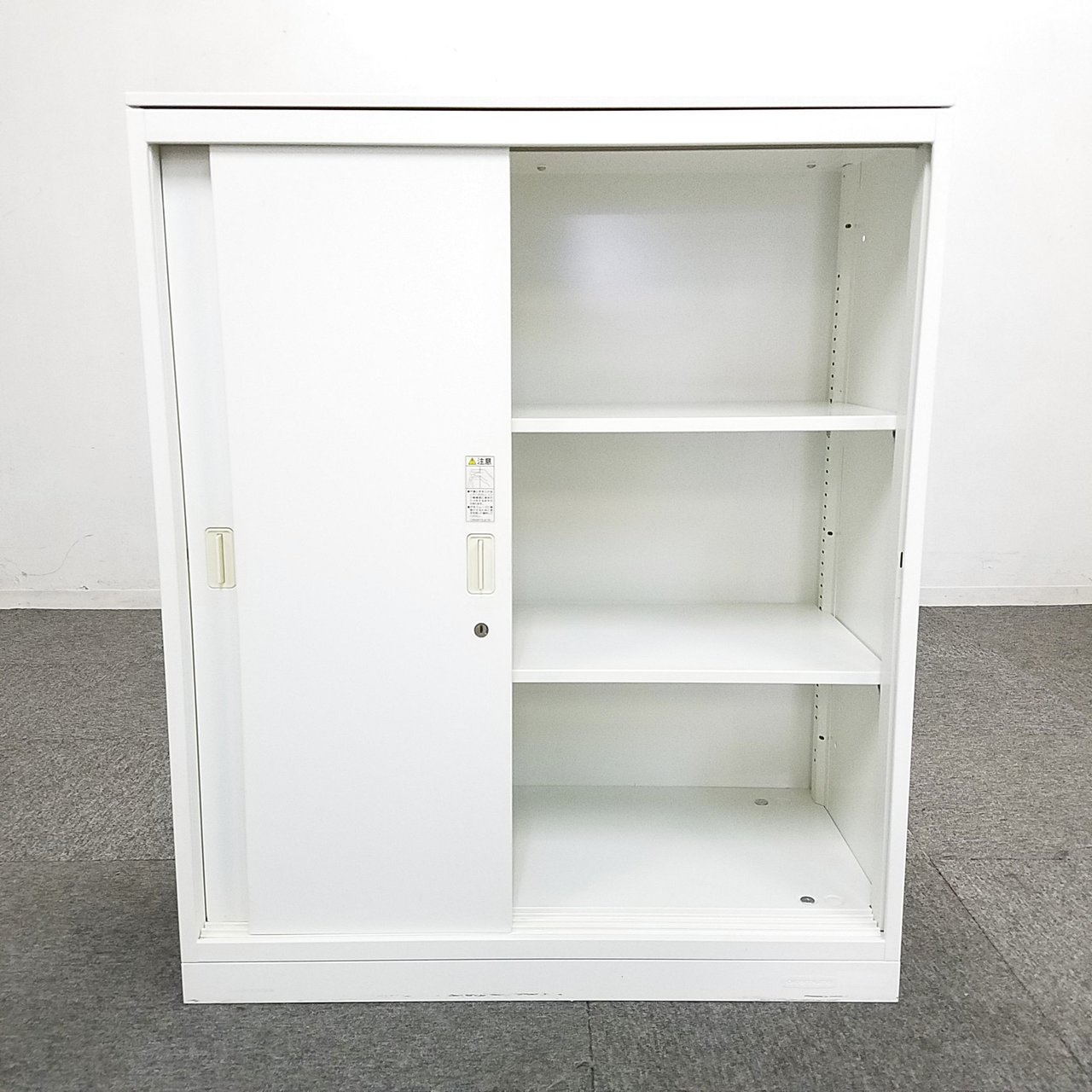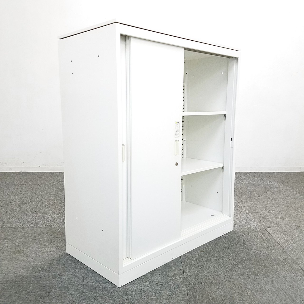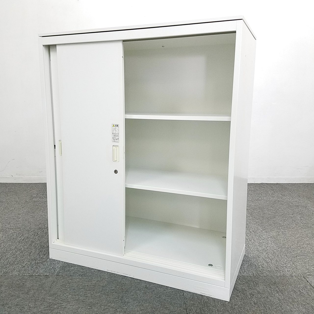 スライド式の扉のため導線を邪魔しません!使い勝手抜群の2枚引き違い書庫が入荷! ■オカムラ/レクトライン/ホワイト 2枚引き戸