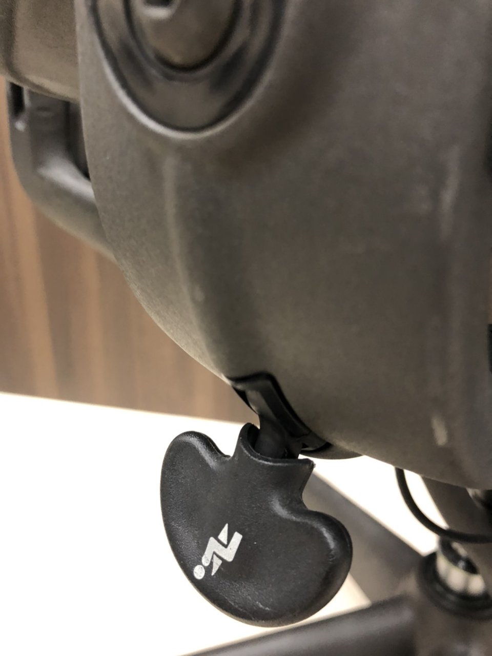 - ノブを+方向に回すと背もたれのリクライニング が硬くなり、-方向に回すと柔らかくなります。