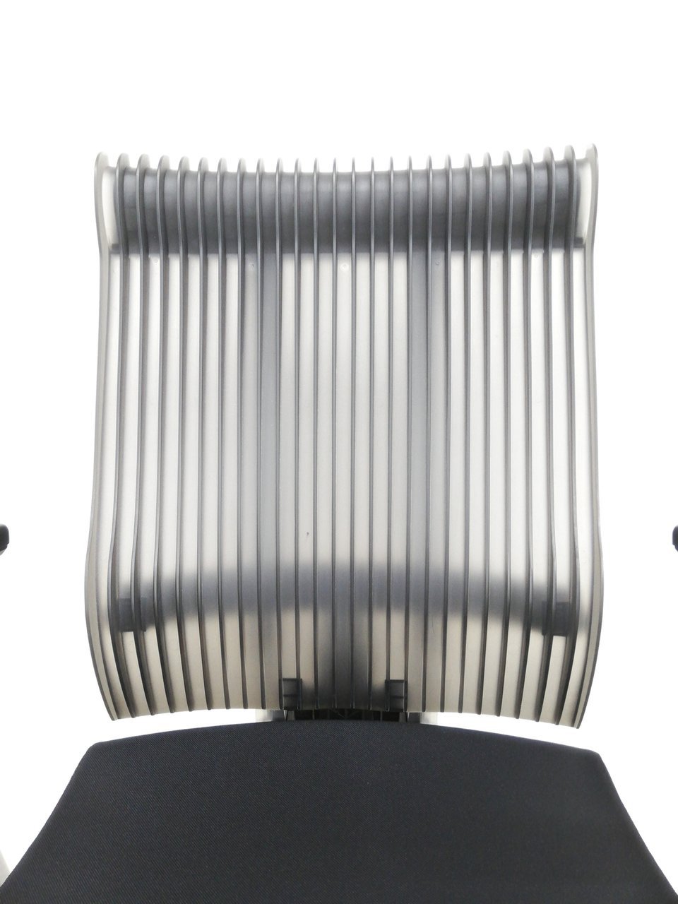 見た目は少し硬そうに見えるエラストマー素材ですが、座ってみると程よいしなり具合のやわらかな座り心地で、背中が痛くなるようなことはまるでありません。面ではなく線で支えることで、背面の通気性の良さは抜群です。