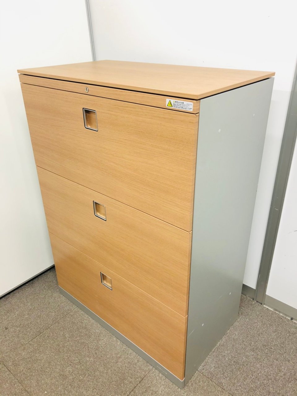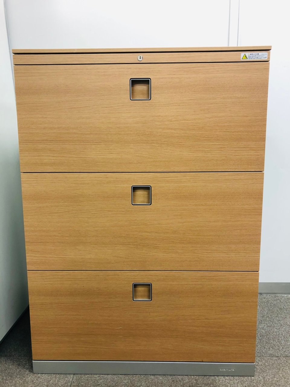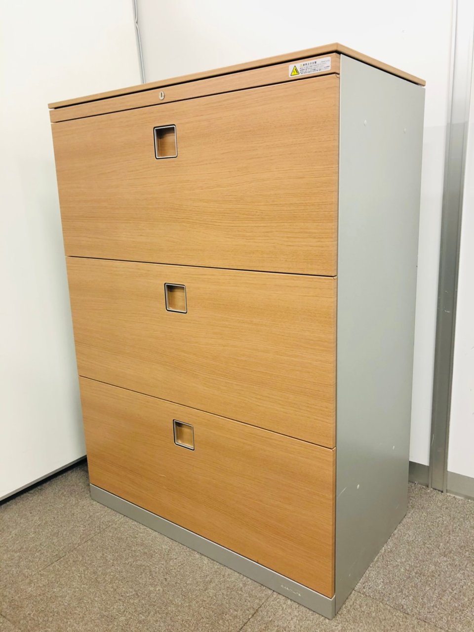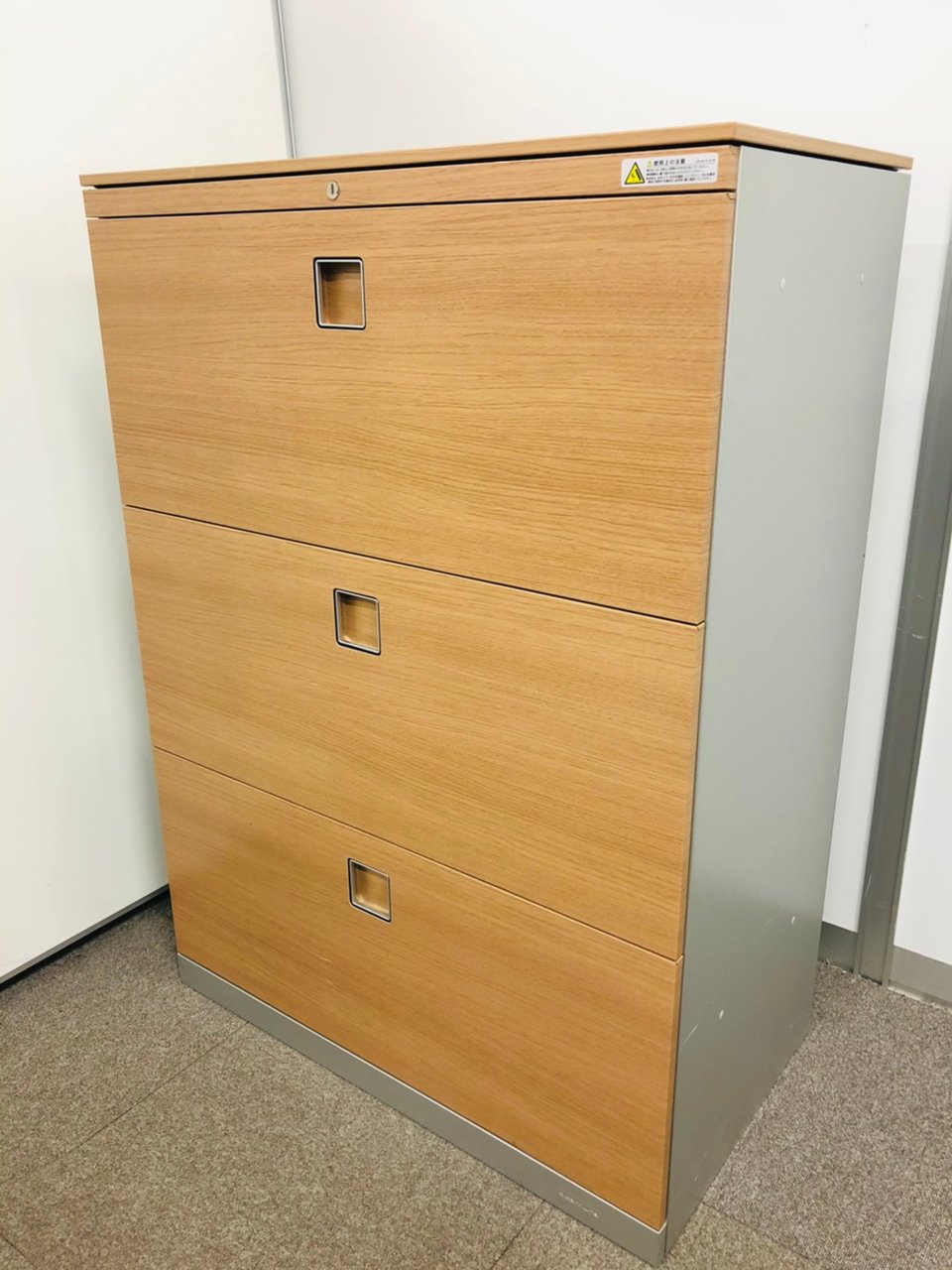 【西】【珍しいカラーリング!高品質で使いやすい人気の3段引き出し式書庫!】■オカムラ(okamura)製 レクトラインシリーズ 3段ラテラル書庫 ローキャビネット ■本体:シルバー 天板・正面・背面:木目調ブラウン 左側面:化粧板付 ■シリンダー錠