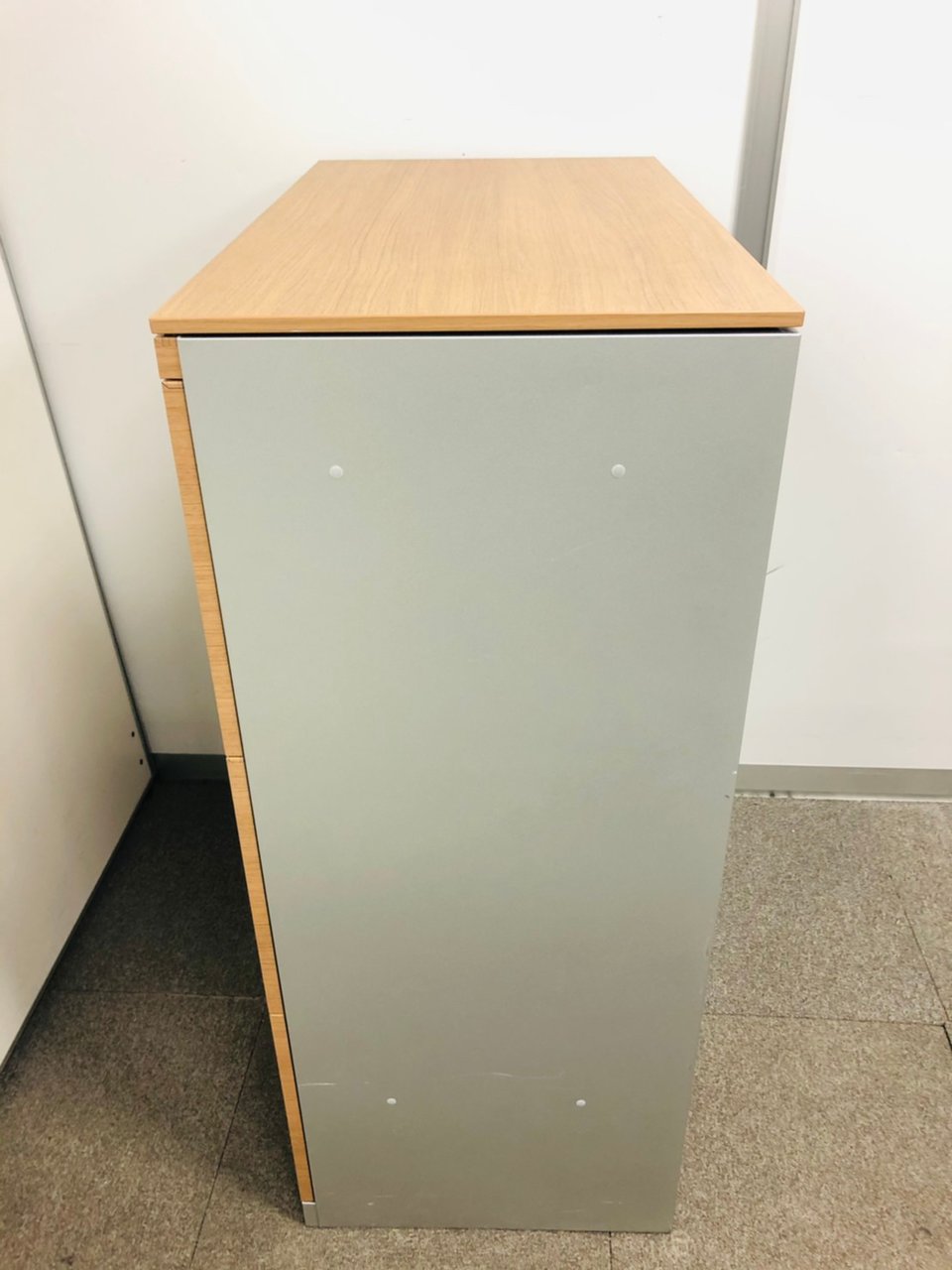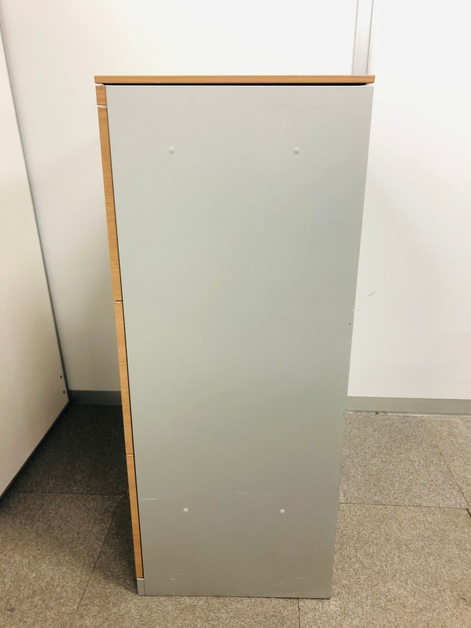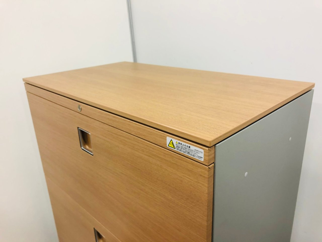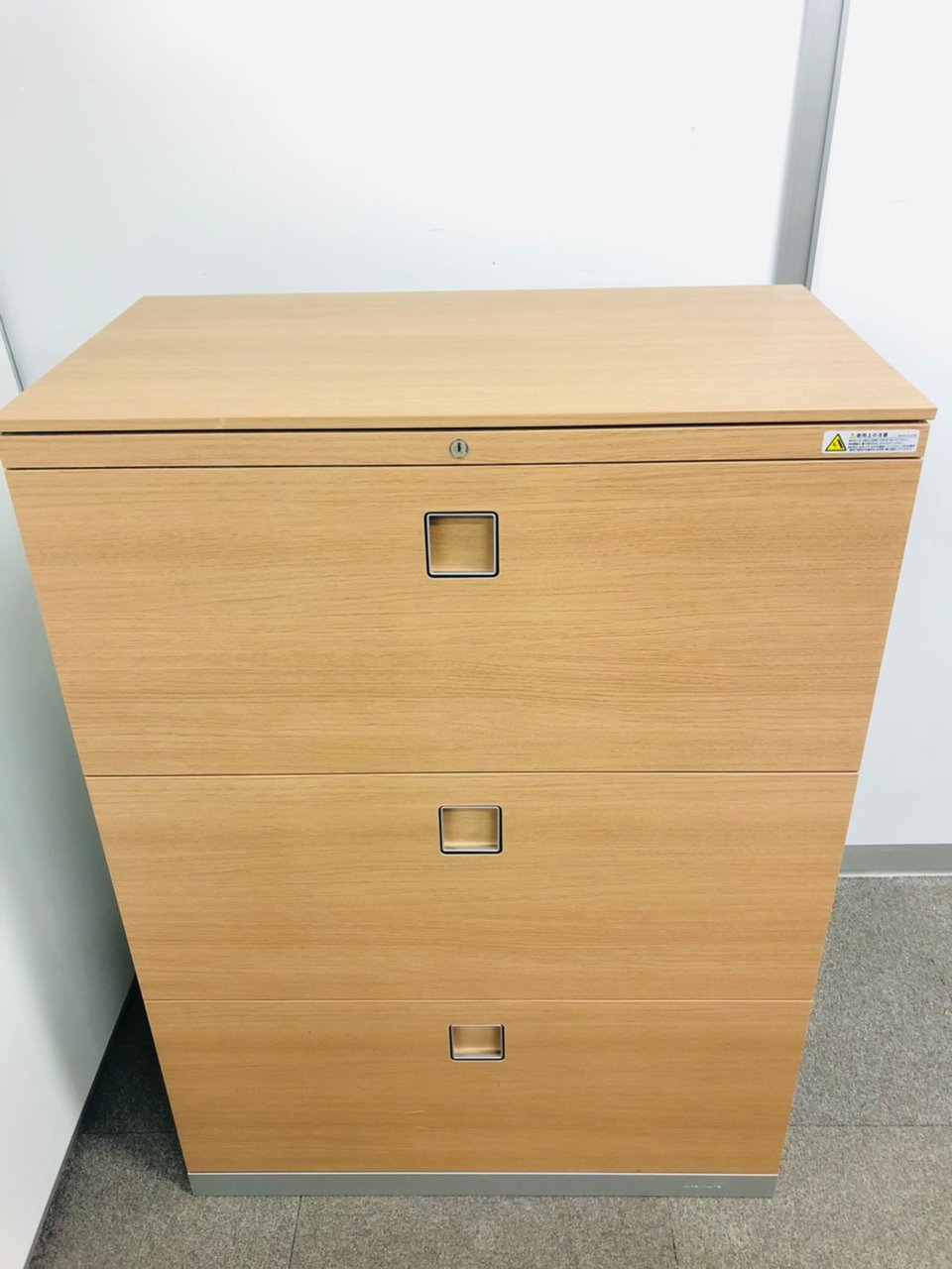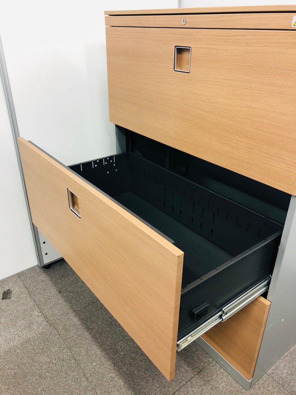 【西】【珍しいカラーリング!高品質で使いやすい人気の3段引き出し式書庫!】■オカムラ(okamura)製 レクトラインシリーズ 3段ラテラル書庫 ローキャビネット ■本体:シルバー 天板・正面・背面:木目調ブラウン 左側面:化粧板付 ■シリンダー錠