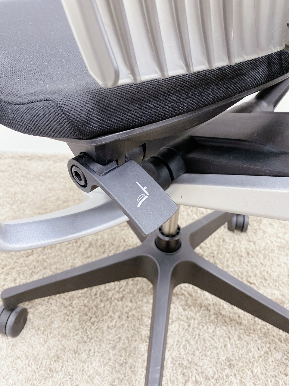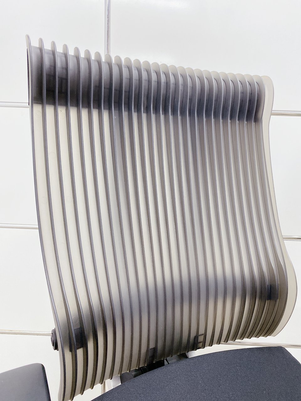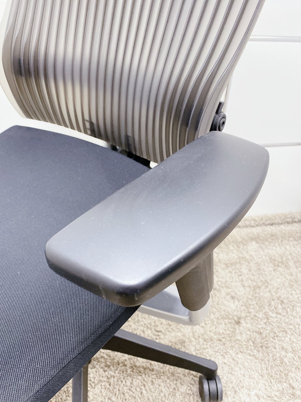 見た目は少し硬そうに見えるエラストマー素材ですが、座ってみると程よいしなり具合のやわらかな座り心地で、背中が痛くなるようなことはまるでありません。面ではなく線で支えることで、背面の通気性の良さは抜群です。