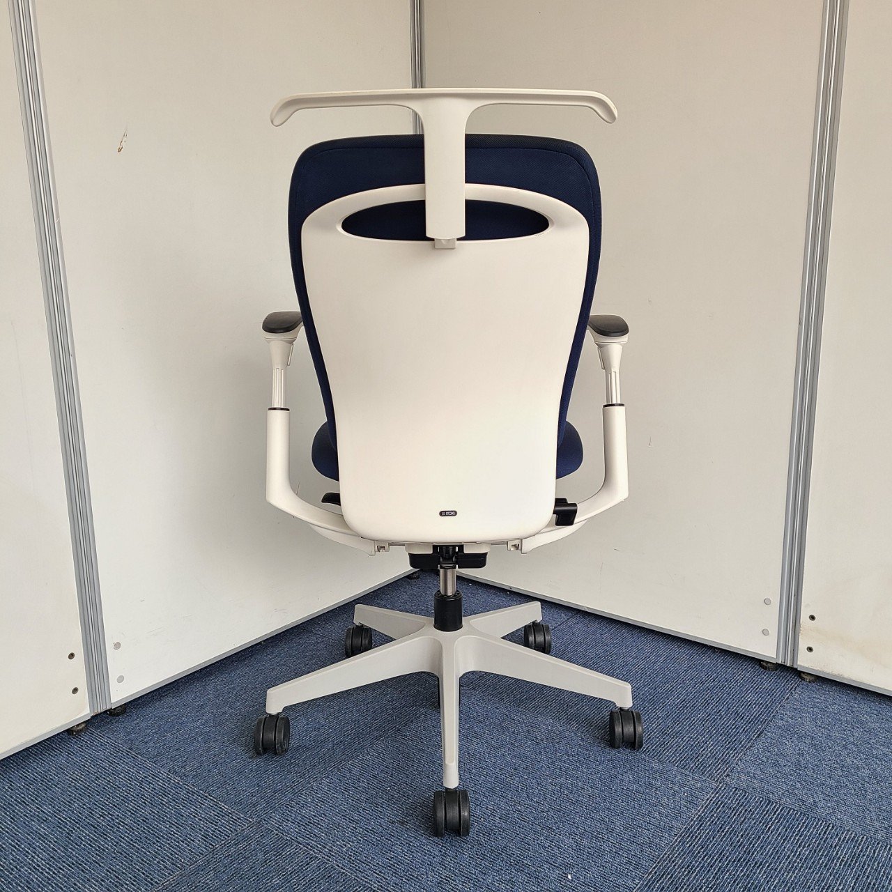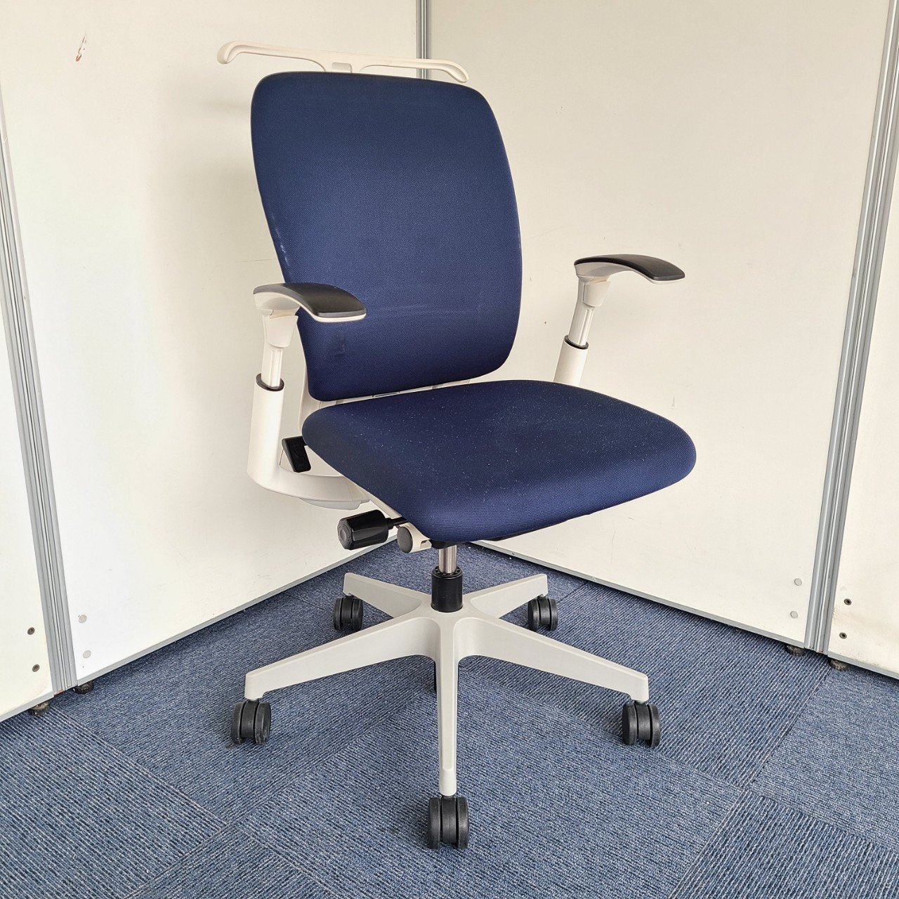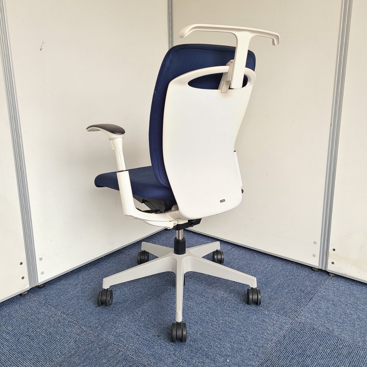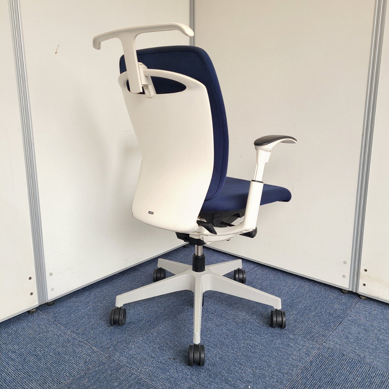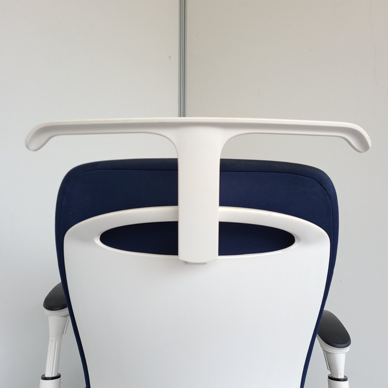 ★イトーキ製 フルゴ ネイビーブルー ホワイトフレーム 肘付き ハイバック サークル肘※固定肘 樹脂脚 座る人を選ばない、個性派シンプルスタイル背もたれ上部の取手デザインには、汚れ対策、取り回しのしやすさ 肘付きハイバックチェア!!
