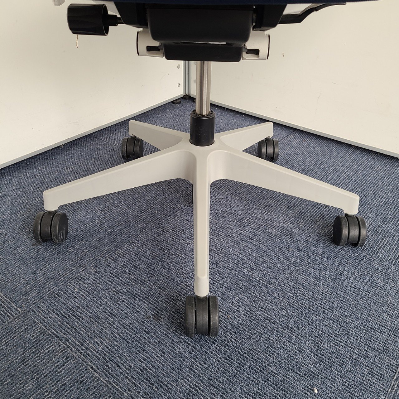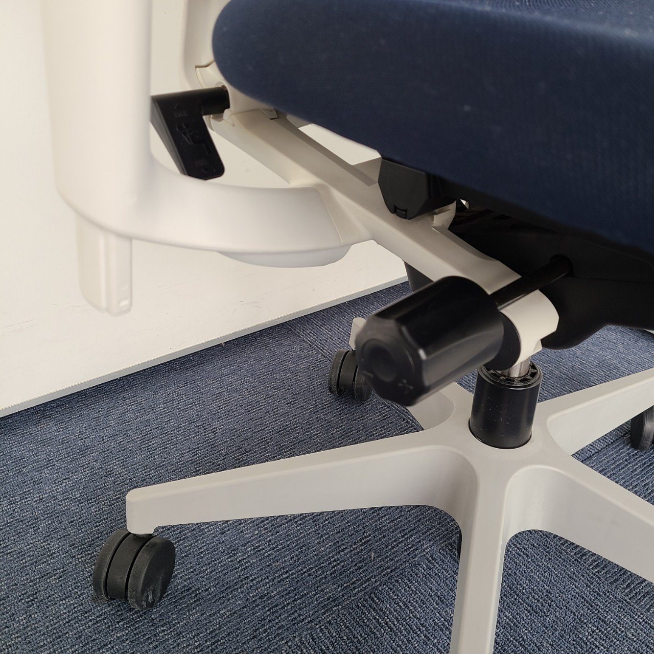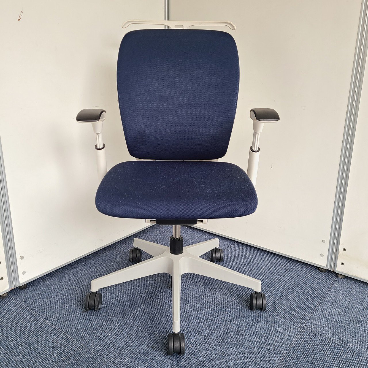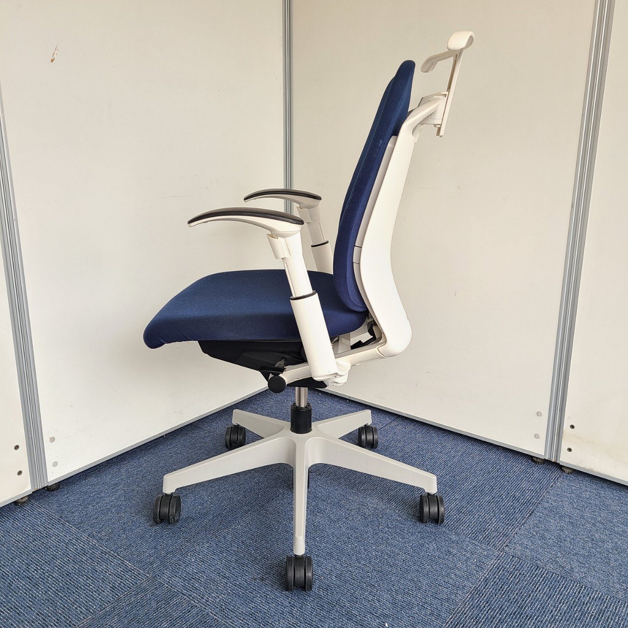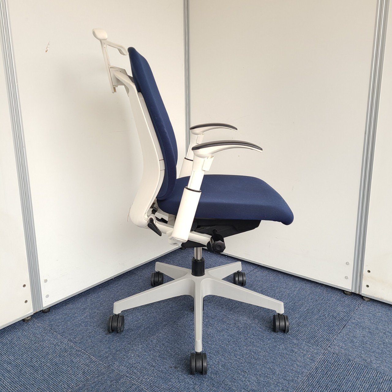 ★イトーキ製 フルゴ ネイビーブルー ホワイトフレーム 肘付き ハイバック サークル肘※固定肘 樹脂脚 座る人を選ばない、個性派シンプルスタイル背もたれ上部の取手デザインには、汚れ対策、取り回しのしやすさ 肘付きハイバックチェア!!