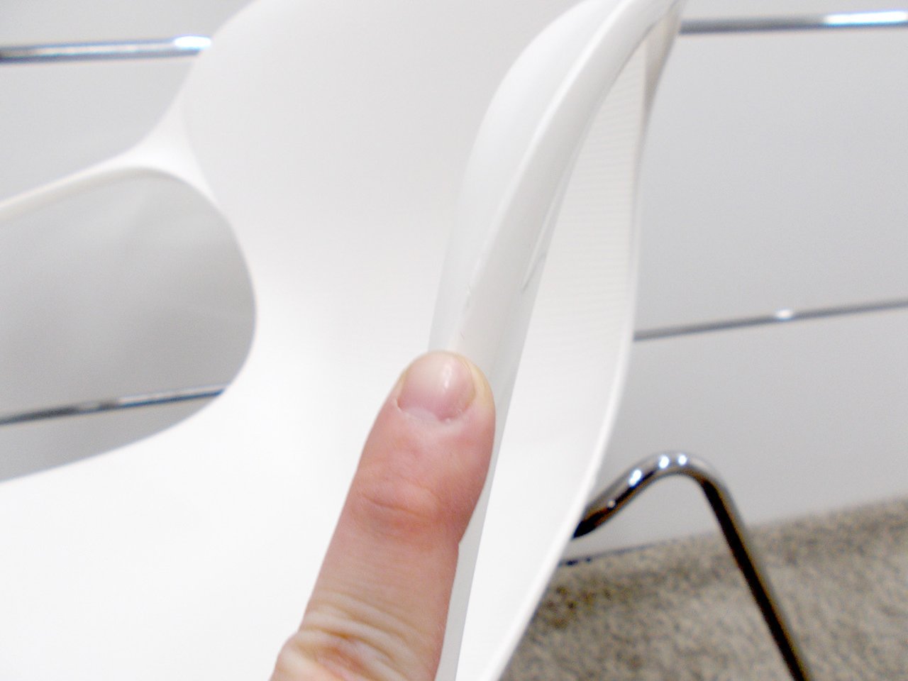 - かなり強い濃い黄ばみ・変色が商品全体にある。(例、座面・背もたれ、脚部等にある。)