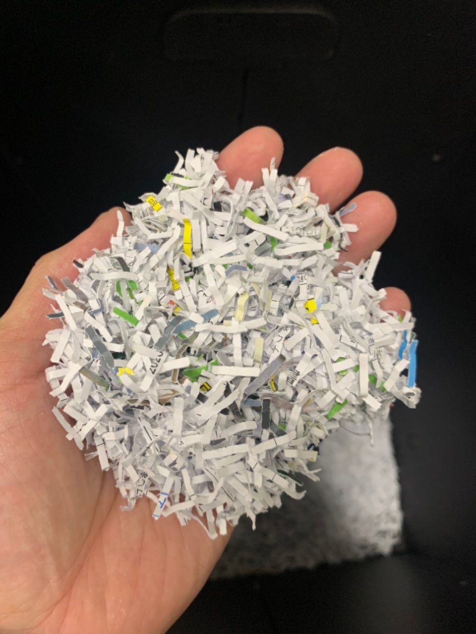 ・細断くずはクロスタイプの2X15mmで、A4コピー用紙を同時に12枚細断可能です。