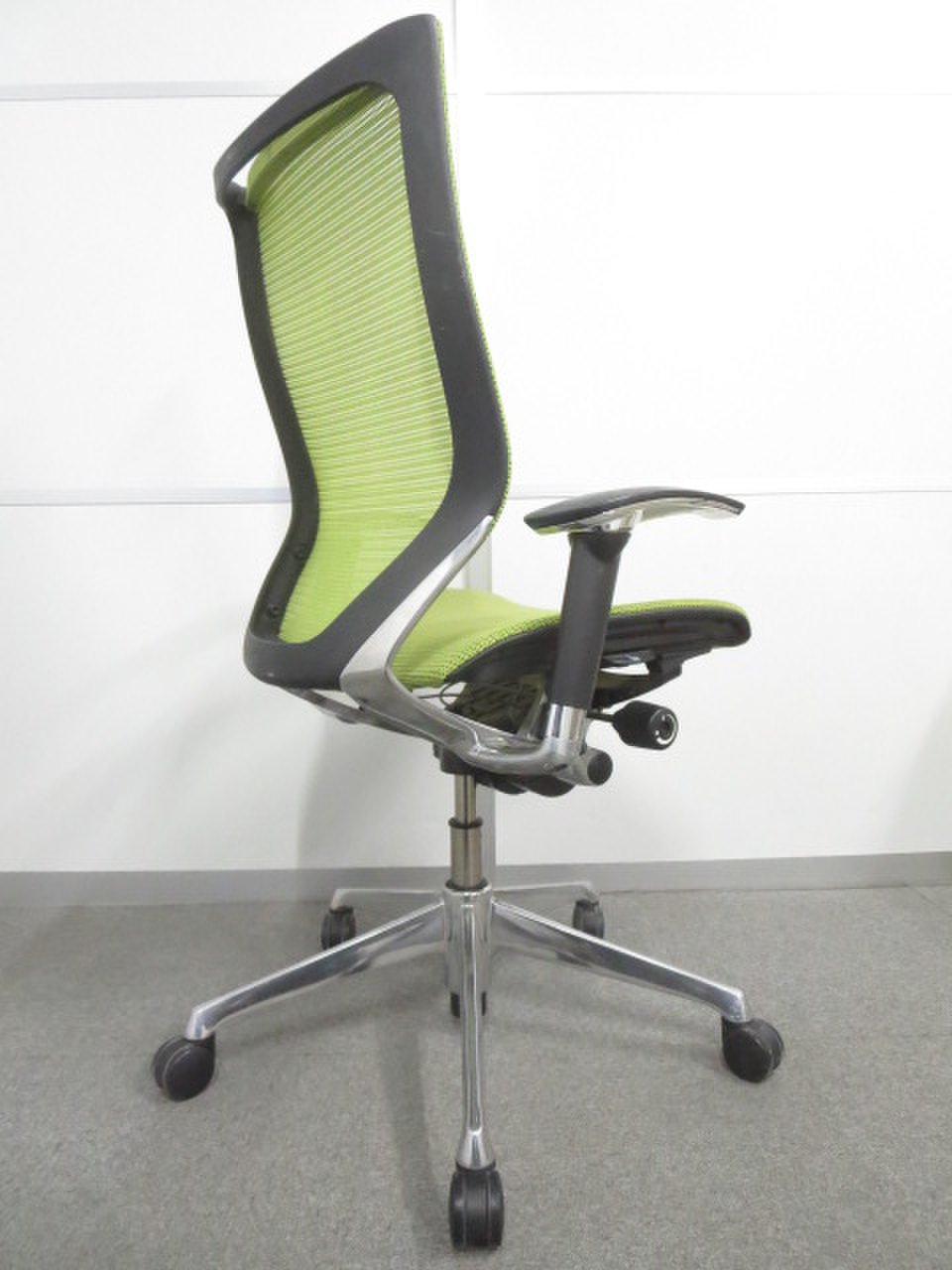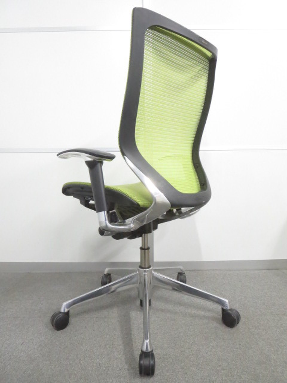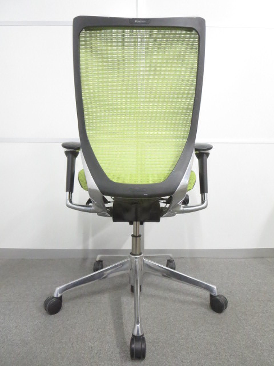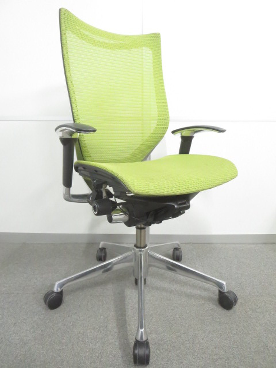 【先進のエルゴノミクスチェア!】■オカムラ製 バロンチェア ライムグリーン(背座メッシュ) 可動肘 ポリッシュフレーム【おつとめ品】※昇降ガスやや弱め。。サーキュラーバリューCO2削減量の算出について