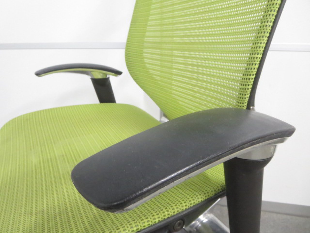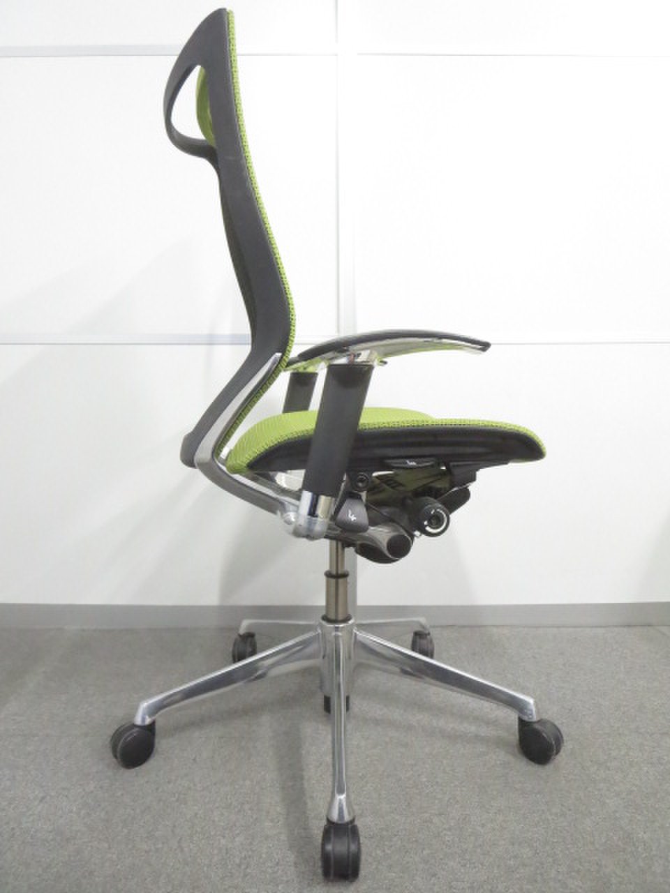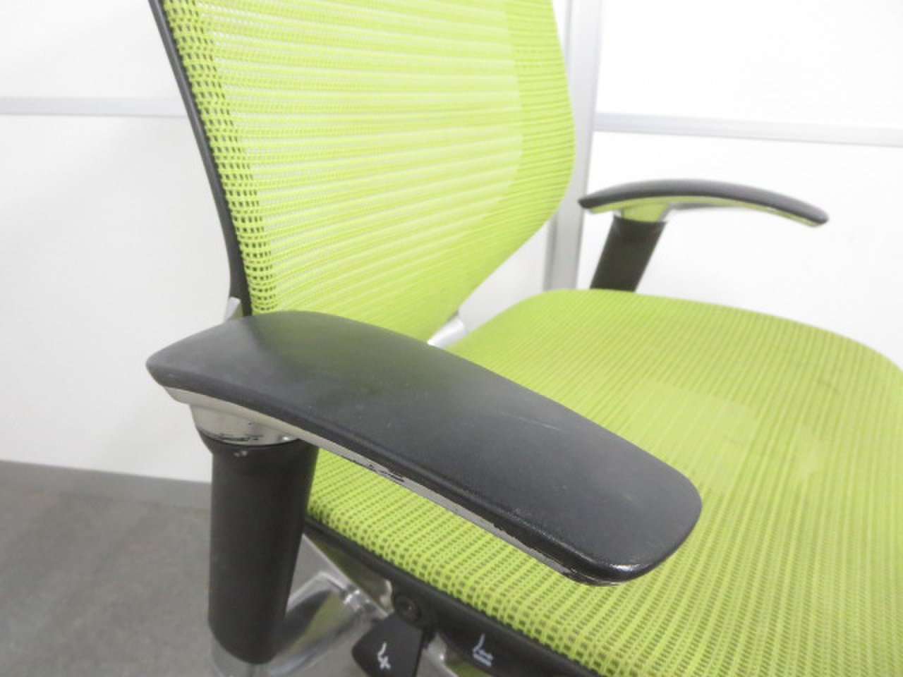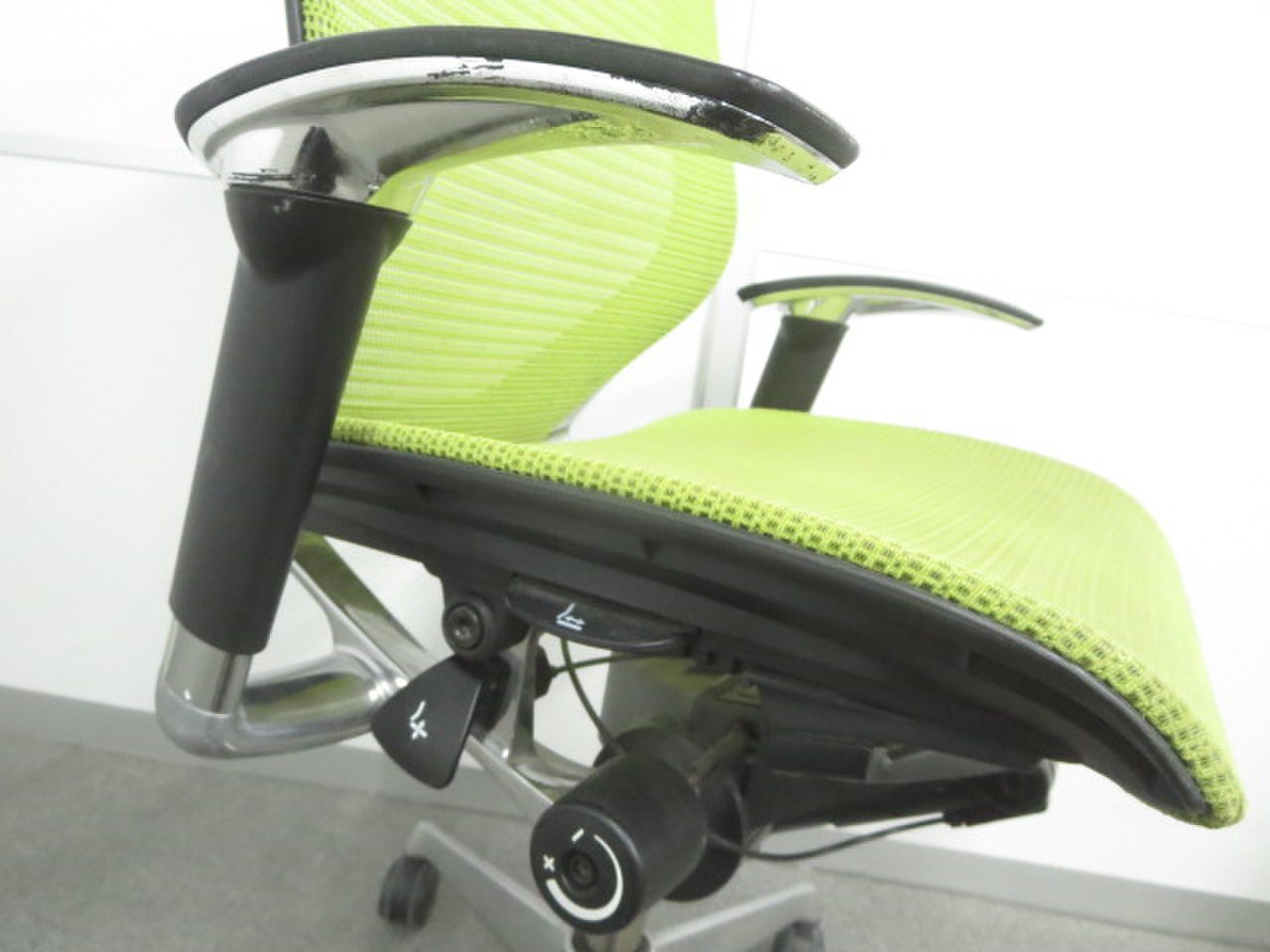 【先進のエルゴノミクスチェア!】■オカムラ製 バロンチェア ライムグリーン(背座メッシュ) 可動肘 ポリッシュフレーム【おつとめ品】※昇降ガスやや弱め。。サーキュラーバリューCO2削減量の算出について