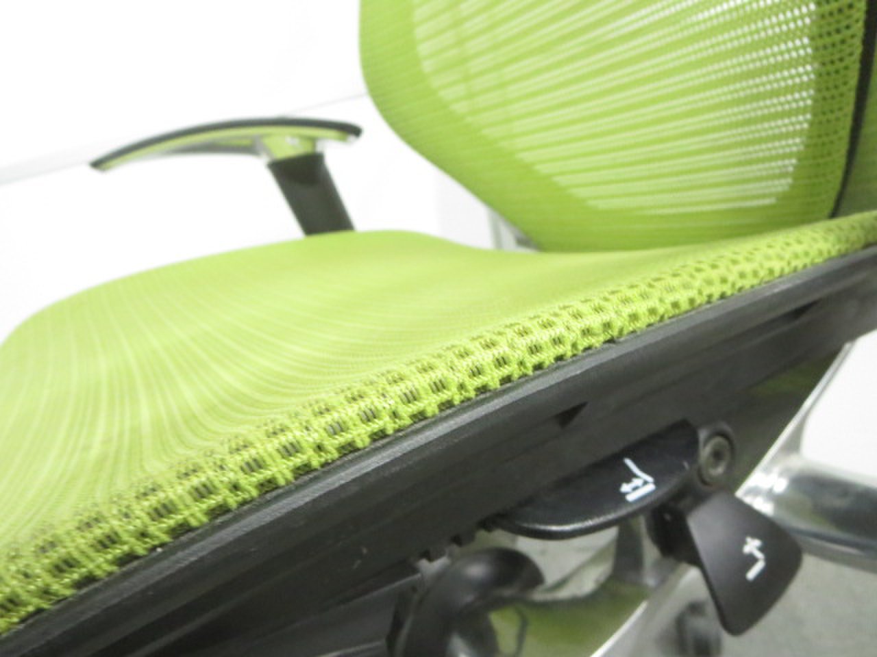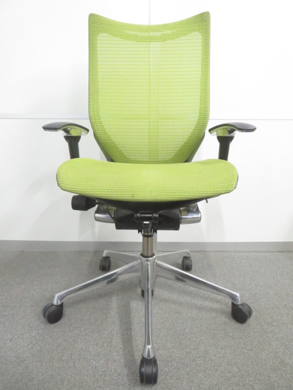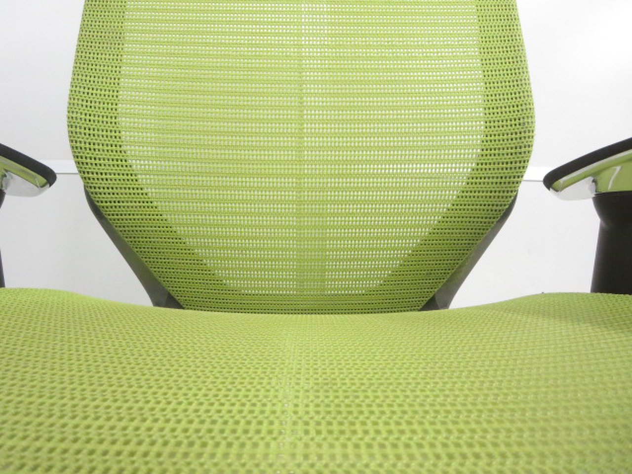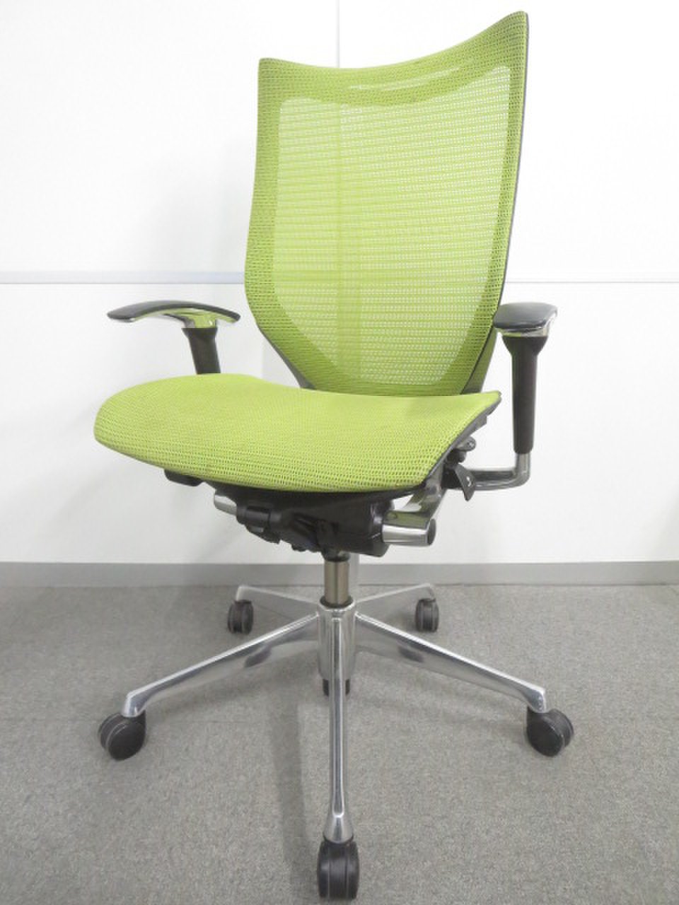 【先進のエルゴノミクスチェア!】■オカムラ製 バロンチェア ライムグリーン(背座メッシュ) 可動肘 ポリッシュフレーム【おつとめ品】※昇降ガスやや弱め。。サーキュラーバリューCO2削減量の算出について
