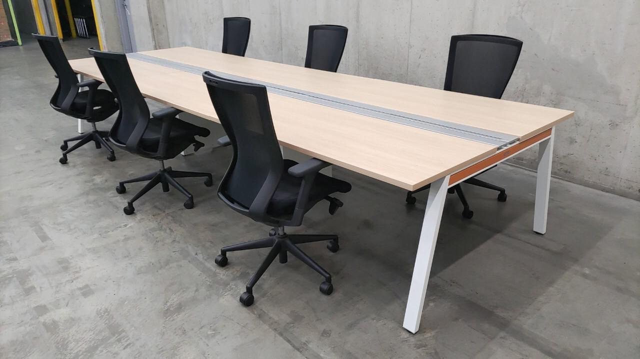 幅4200mm【オフィスのフリーアドレス化にも!】明るい木目天板にホワイトの脚が映える!オカムラ/マニフォールド【倉庫在庫品】オレンジエンブレム- 在庫数