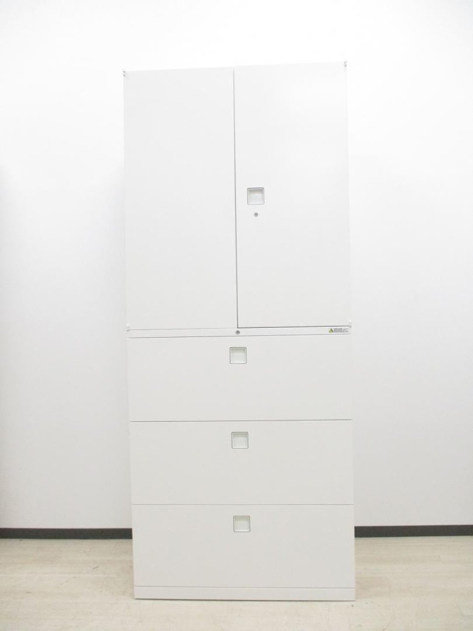 スライド式の扉+引き出しタイプの便利な書庫セットが入荷!使い勝手抜群のハイキャビネットが入荷! ■オカムラ/レクトライン/ホワイト 2枚引き戸+3段ラテラルキャビネット