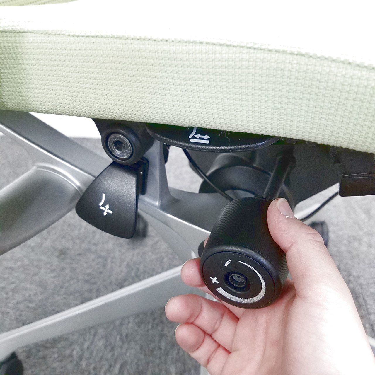 もちろん座り心地もコンテッサの直系ですから快適です。座面の素材はクッションとメッシュの2タイプあります。私、個人的には座面の中心部分でも外側でもテンションが変わらないクッション素材が、足を閉じても開いても快適なので推しです!"