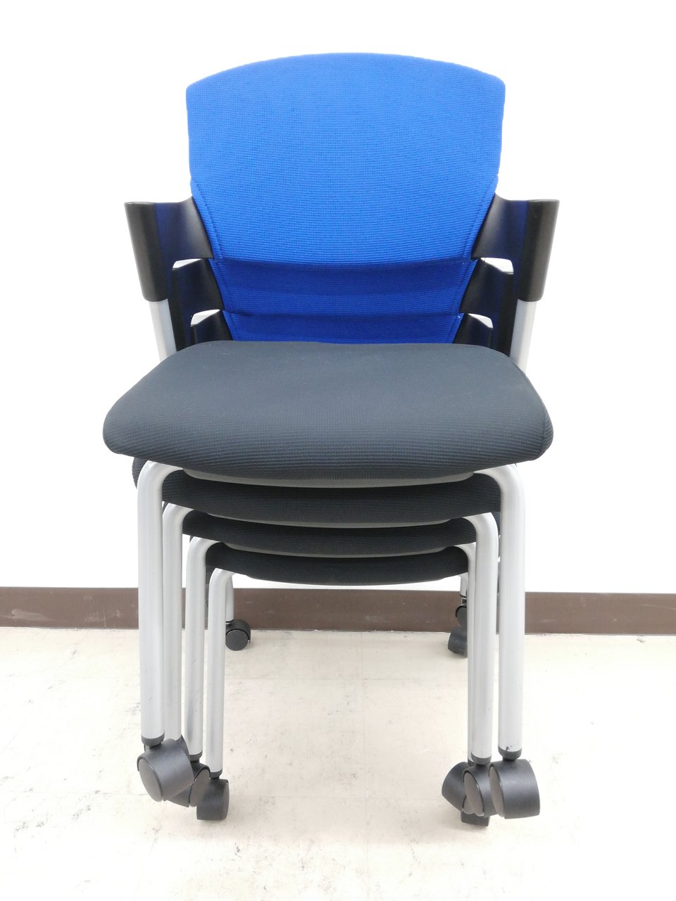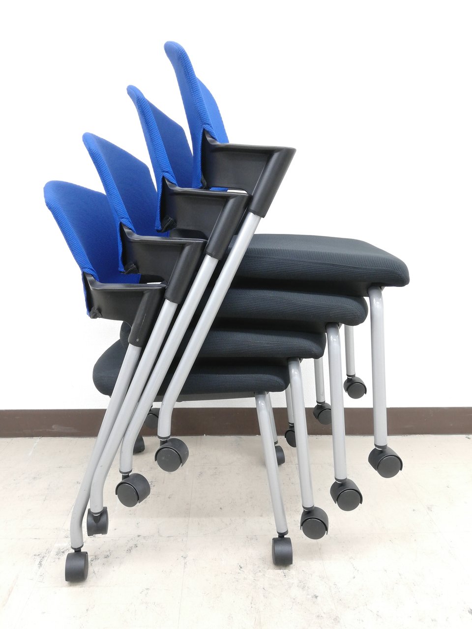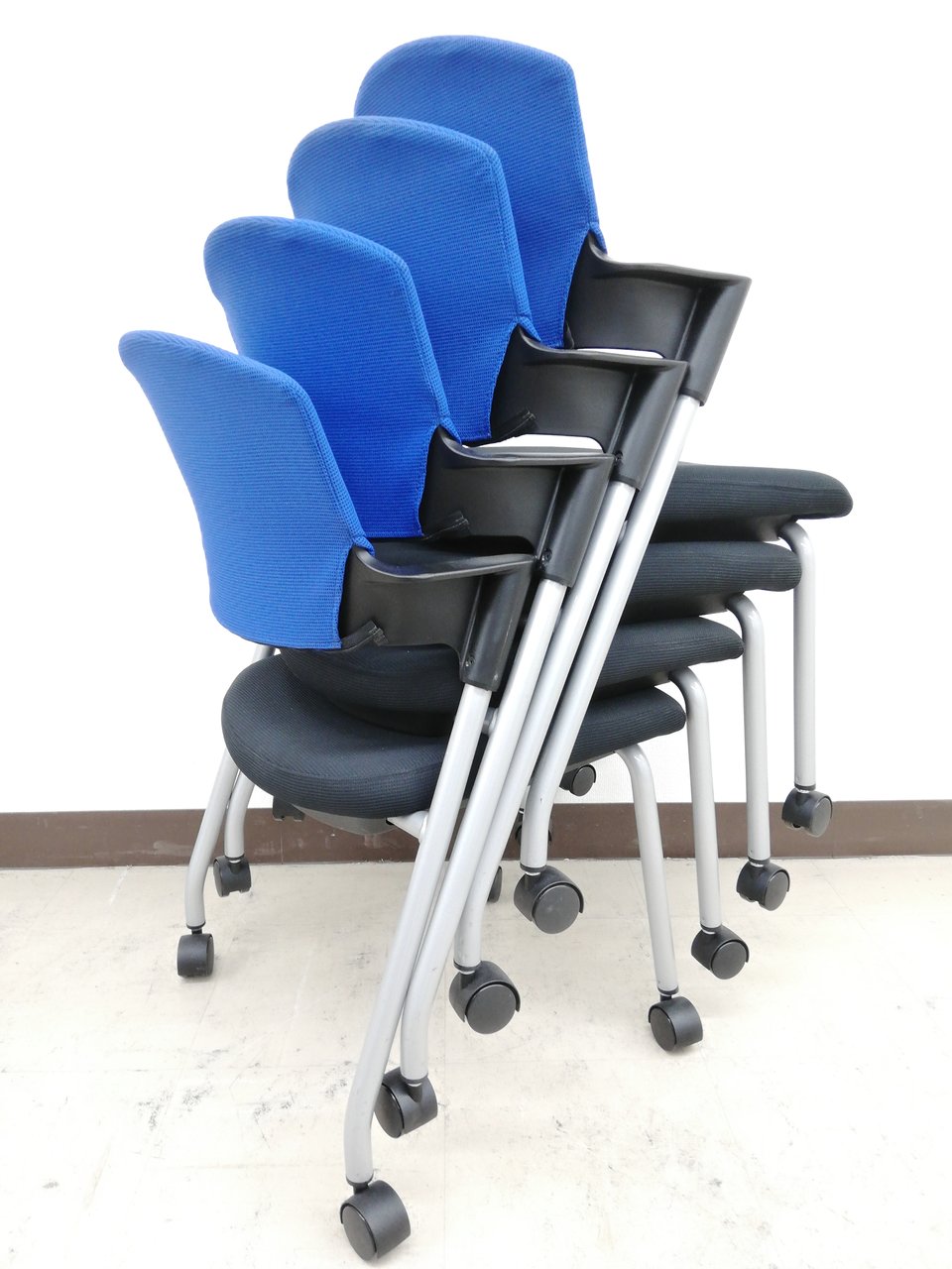 【セットお買い得】背もたれブルー&座面ブラック!定番スタッキングチェア4脚セット※キャスター付き◆コクヨ製【RP】- 埼玉本店