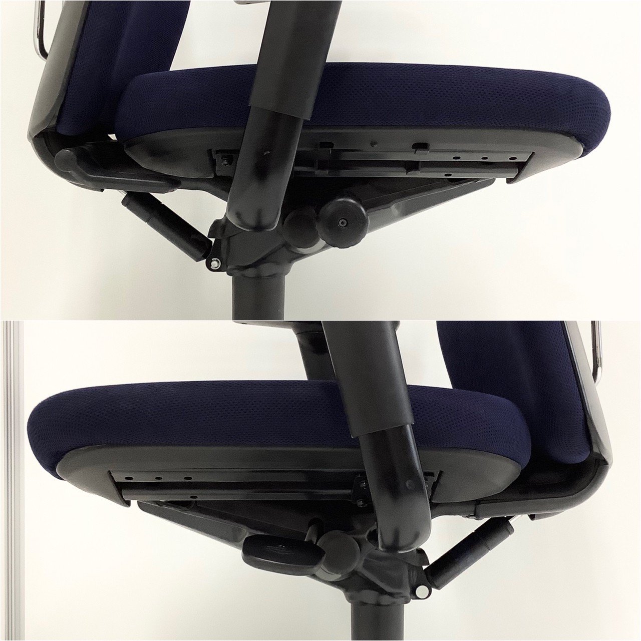 もう一つは、オカムラ社独自の""異硬度クッション""が座面に採用されていることです。これは座面が位置により異なる硬さのウレタンでできており、前方は腿裏を圧迫しないようソフトに、後方はしっかりと体重を支えるために少し硬めに作られています。クッション性とホールド感の両立により、長時間の作業での疲れを軽減してくれます。"